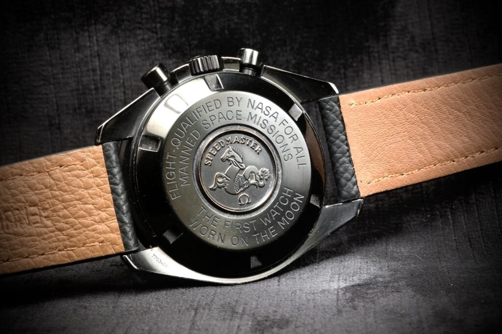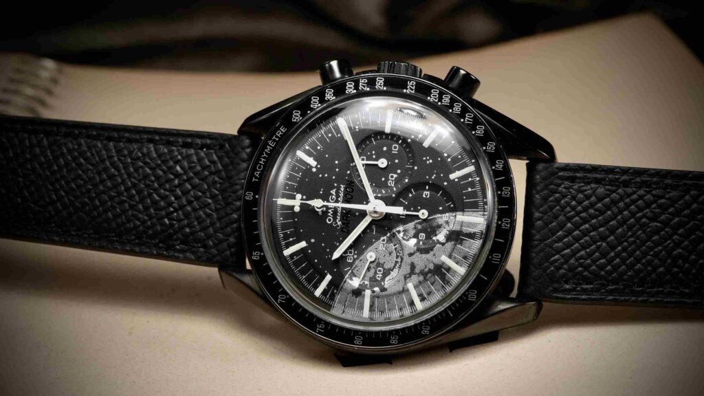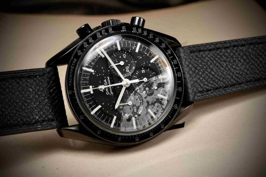This is not a prototype, nor part of a series—it is a one-off creation, assembled and regulated by skilled hands and executed with absolute respect for the Moonwatch legacy. It pays homage to the original chronograph that accompanied NASA astronauts, while boldly reframing its visual language for a new context: darker, graphic, and emotionally charged.