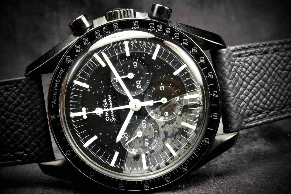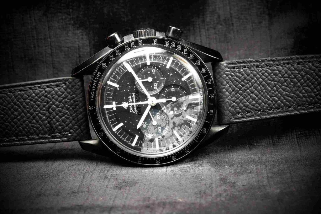 For the dial, once Alessandro designed this dial we worked with a professional dialmaker to realize our custom concept—a single-piece dial with stylized lunar texture and cosmic speckling that evokes a dramatic, almost cinematic view of the Moon’s surface. The logo and typography draw inspiration from Omega’s own Dark Side of the Moon line, but go further in tone and contrast, blending matte and glossy finishes with luminous hour markers for clarity and depth.
