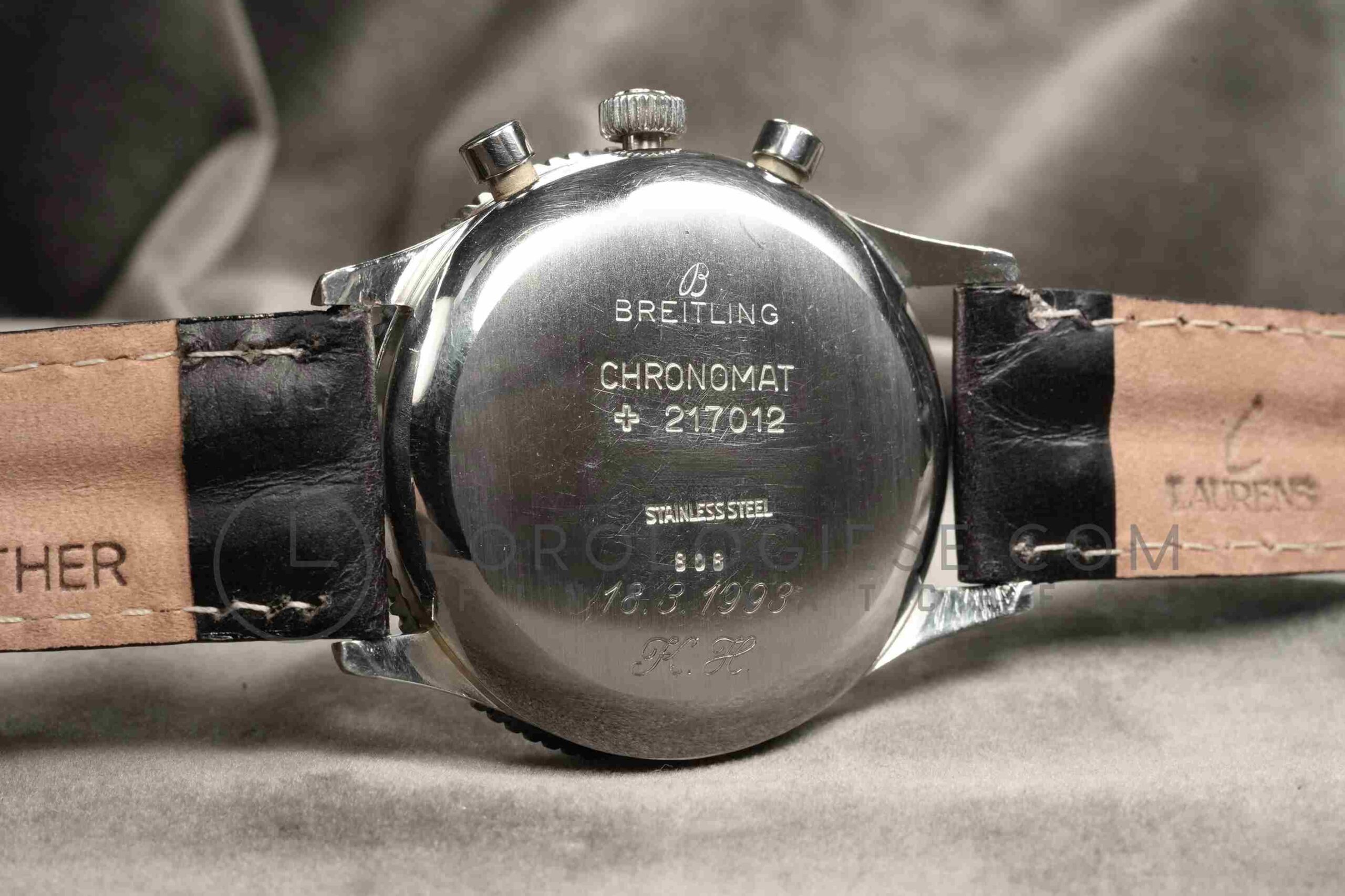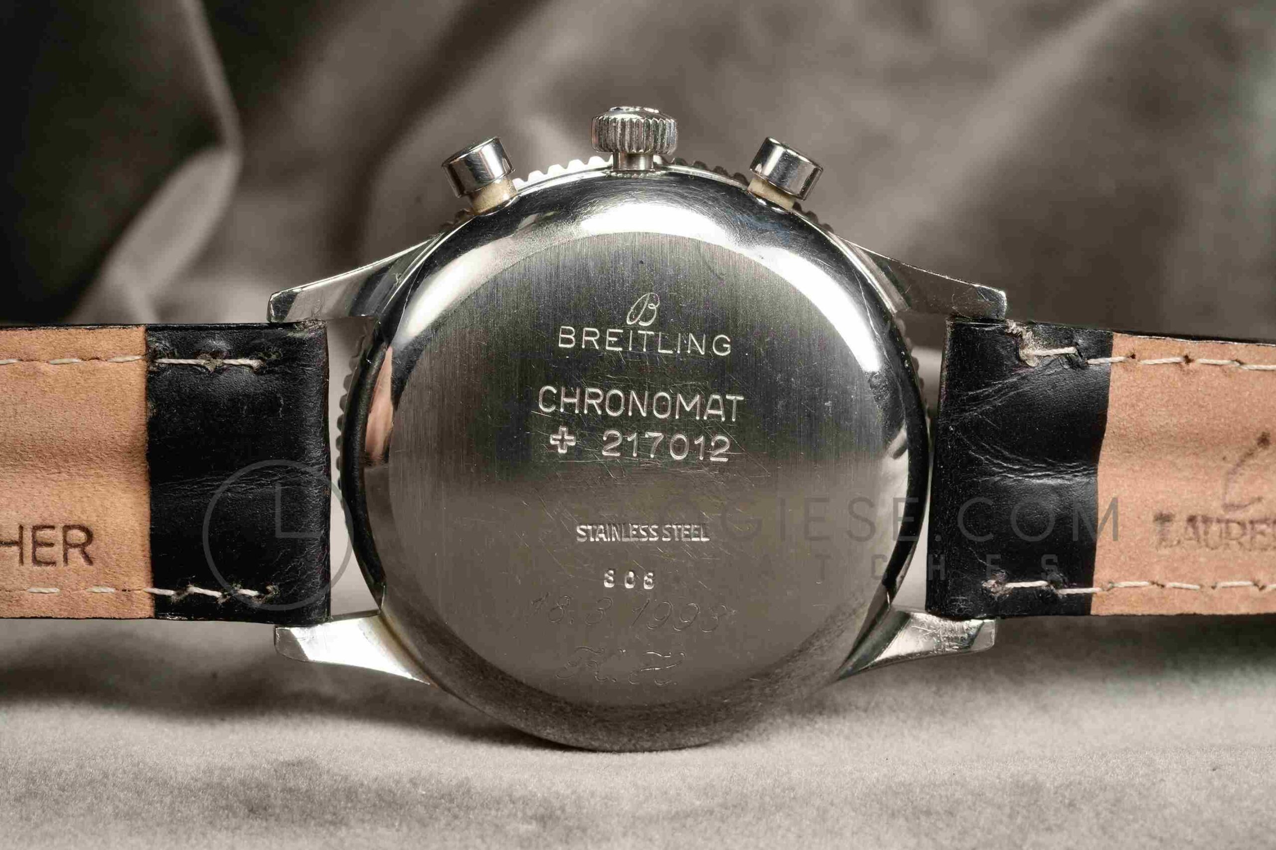 This Breitling Chronomat reference 808 occupies a position of historical significance within the brand’s chronograph production. The slide rule function was patented in 1941 and released between 1941 and 1942, establishing this model as the predecessor to the Navitimer. The name Chronomat derives from the combination of chronograph and mathematics, reflecting its original purpose. The reference 808 was released in the late 1950s, introducing round pump pushers and baton hour markers. The case measures 37mm in diameter, excluding the crown, its chrome-plated with a stainless steel snap caseback. The case shows only light traces of use consistent with responsible ownership over nearly six decades, the caseback lockt tight and has the correct serial numbers and manufacturer markings including patent number 217012. The plexiglass crystal is in pristine condition. The original silvered dial rwith raised baton markers and the distinctive bi-directional rotating inner slide rule bezel.