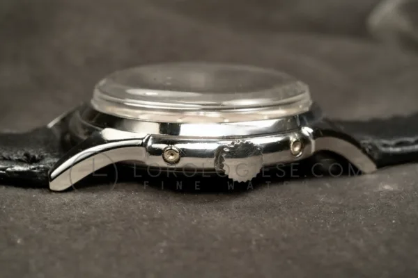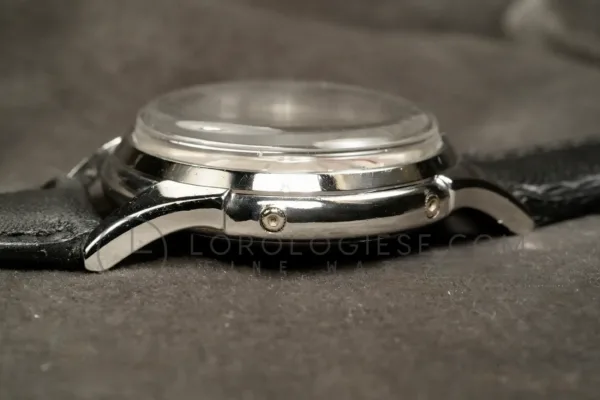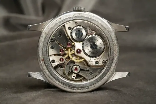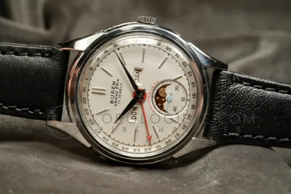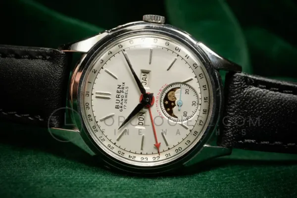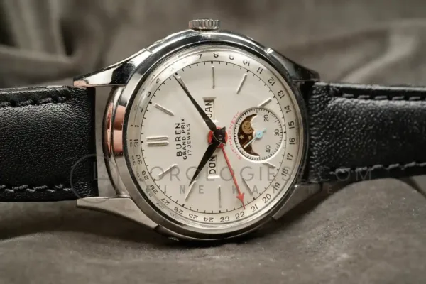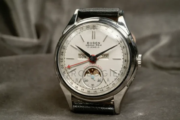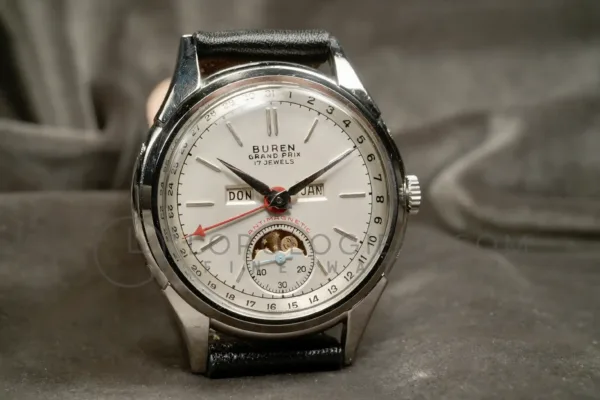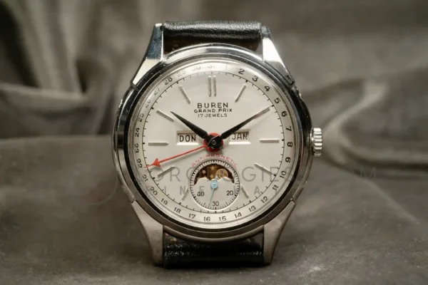 This Buren GrandPrix wristwatch with calendar and moonphase, dates from the 1950s and it is in a very good working condition and just serviced. The stainless steel case measures 34.5 mm in diameter (excluding crown) and is in very good condition with only light traces of wear. The pressure-locked caseback secures firmly and is stamped with the serial numbers.