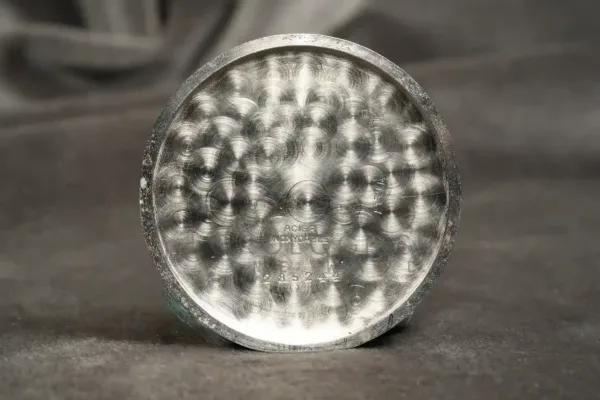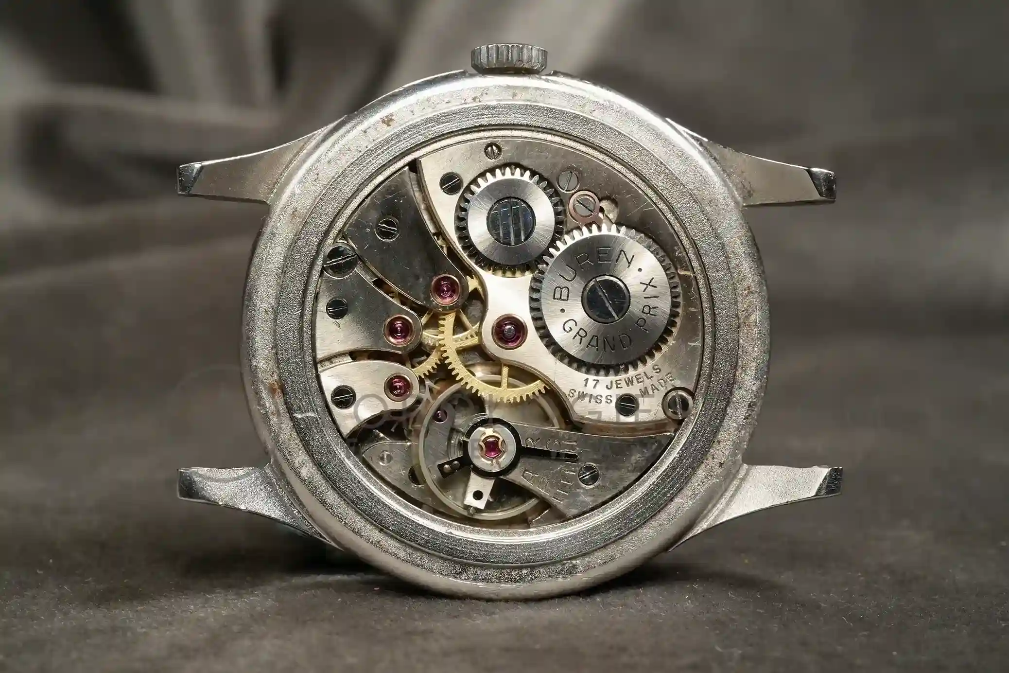 The plexiglass is new. The original silvered dial with applied baton hour indices, a peripheral date ring indicated by a red central hand, and twin apertures for day and month (in German). The small seconds hand is on the moon‐phase display. The Buren logo has been professionally refreshed. The dial is in an excellent condition with no spotting or discoloration. Powered by the manual-wind calibre Buren 382, introduced in 1953 and used through the 1960s is an in-house caliber (base Buren 380), the movement measures 11.5“0, with 17 jewels, and has approximately 42 hours of power reserve.