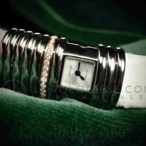 The Cartier Declaration watch takes inspiration from one of the favorite Cartier bracelets of Gloria Swanson, one of the biggest movie stars of the 1920s. The said pair of bracelets were formed by several rings made of rock and crystal and their distinctive bombé silhouette captured the glamour of Hollywood’s golden age. Cartier looked back on these bracelets when creating the Declaration watch in 2004 translating the concept into a timepiece with mobile rings that conceal and reveal the dial. The reference 2611 represents this innovative design approach, combining jewelry artistry with horological function through its jalousie mechanism. The case construction combines stainless steel and titanium, measuring 16mm in width and 34.5mm in length. The case exhibits minimal wear and remains in pristine condition, showing only light traces consistent with careful ownership.