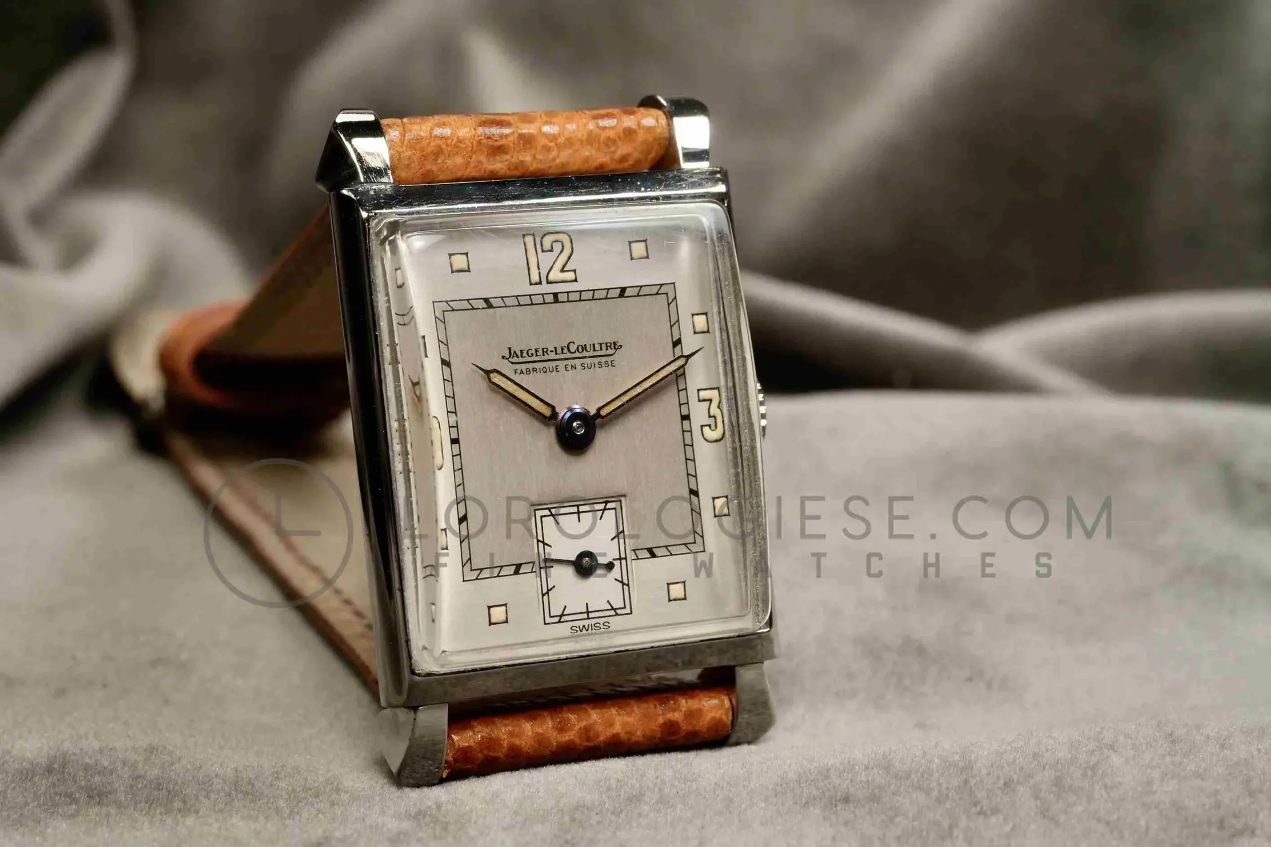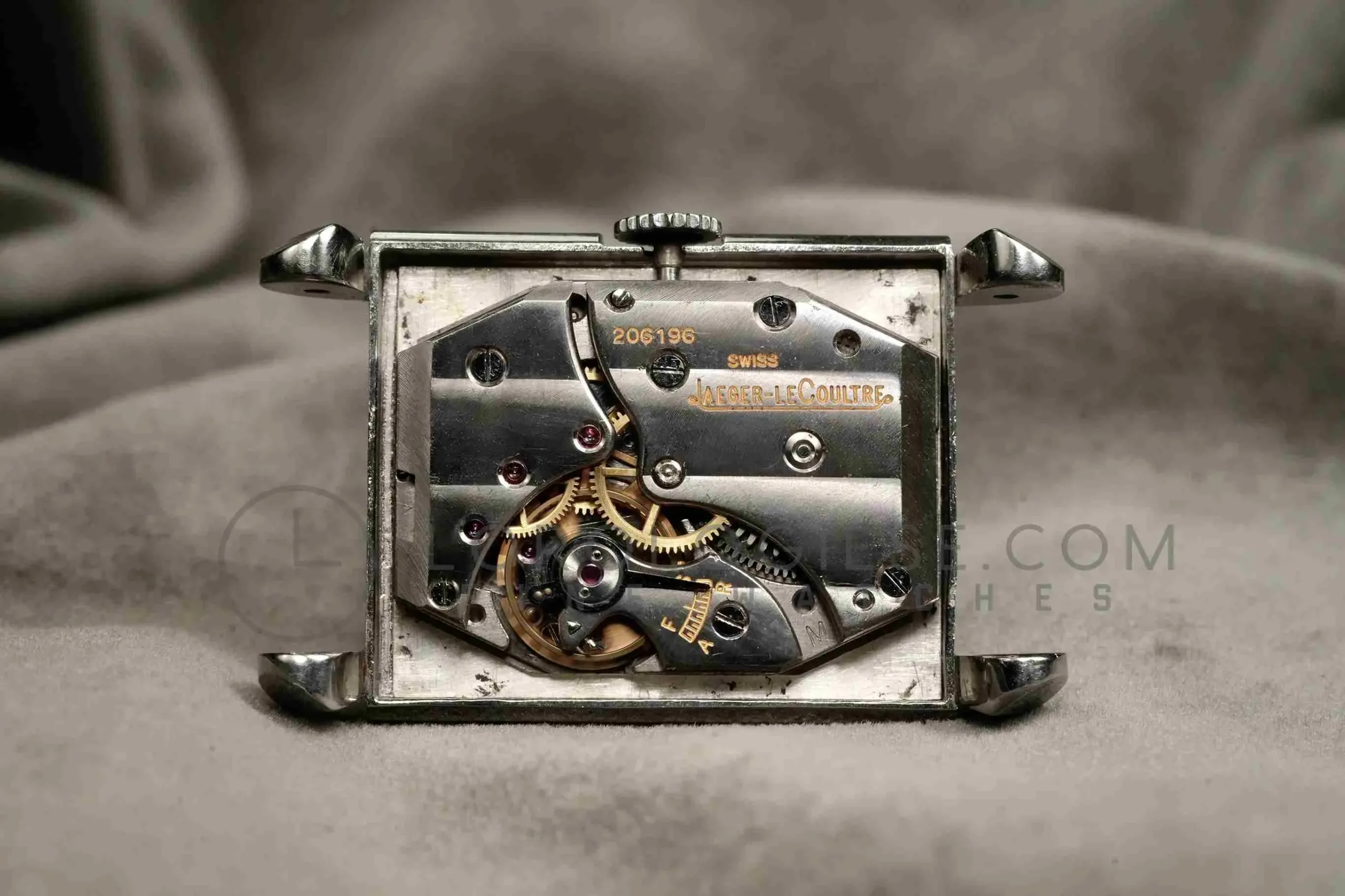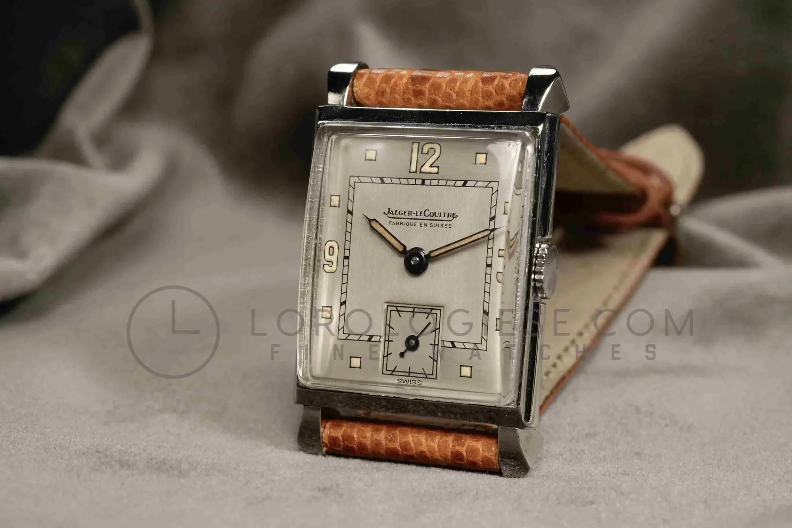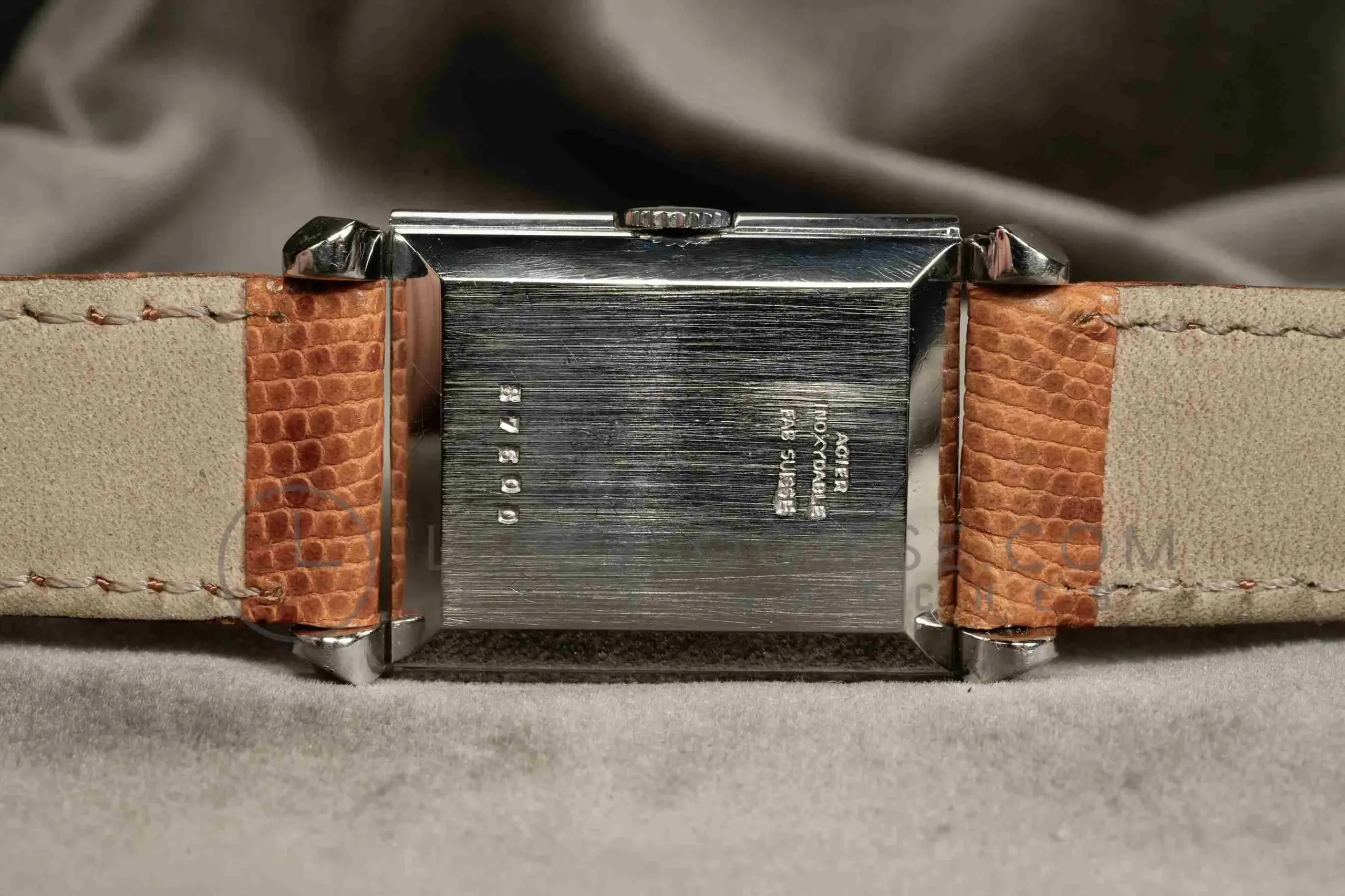 This Jaeger-LeCoultre rectangular tank-style watch is a classic of the manufacture’s Art Deco design in the 1940s, when rectangular watches epitomized modern elegance. The stainless steel case measures 22mm excluding the original crown and 35.8mm including the fancy shaped lugs. The case shows only minimal wear consistent with decades of careful handling. The snap-back caseback engages securely and shows the correct serial numbers and manufacturer markings. The Fab Suisse stamp on both caseback and dial indicates export to France during this period. The plexiglass crystal is in pristine condition. The dial has been professionally restored to two-tone silvered finish, with aged luminescent Arabic numerals and indexes. The restoration is based on the originla dial design while ensuring optimal legibility and the dial is in a perfect – as new – condition The dial back has an inscription of interesting historical significance: the Cross of Lorraine appears above the phrase “Vive de Gaulle,” followed by two names and the date 1951 with Vichy.