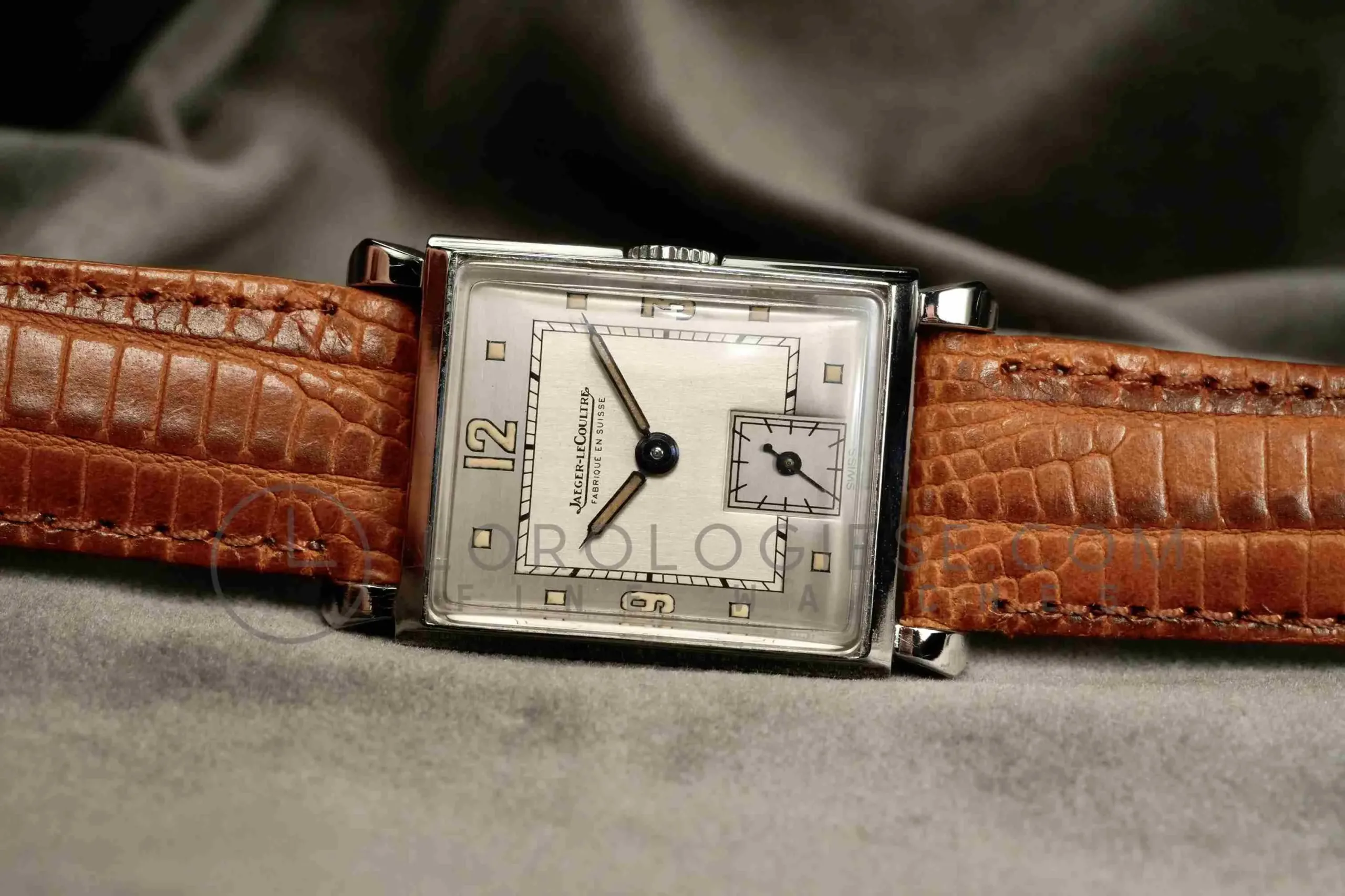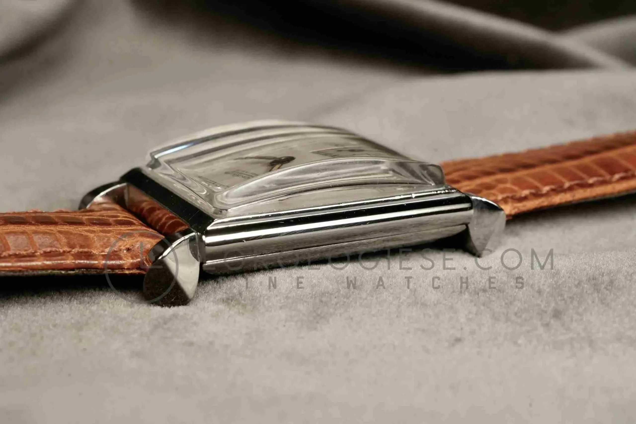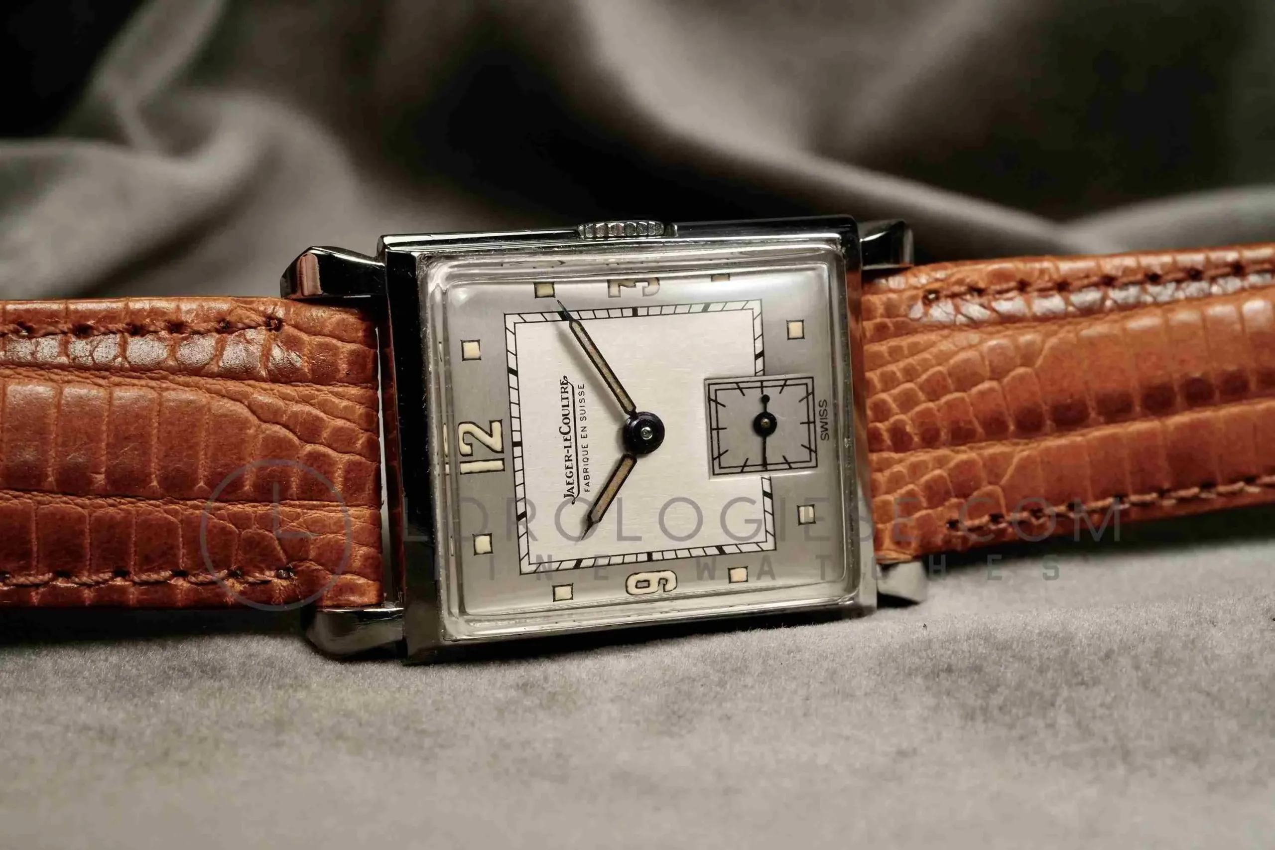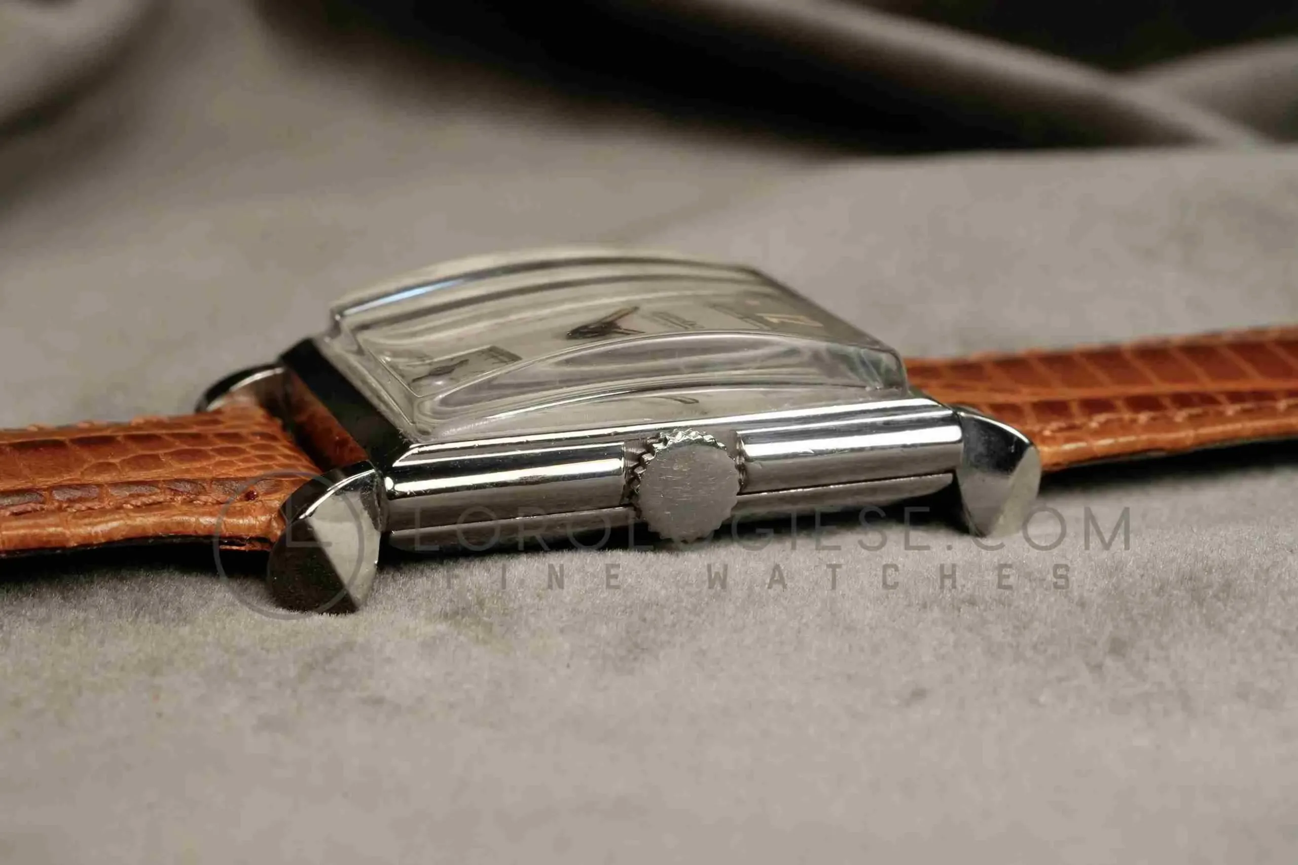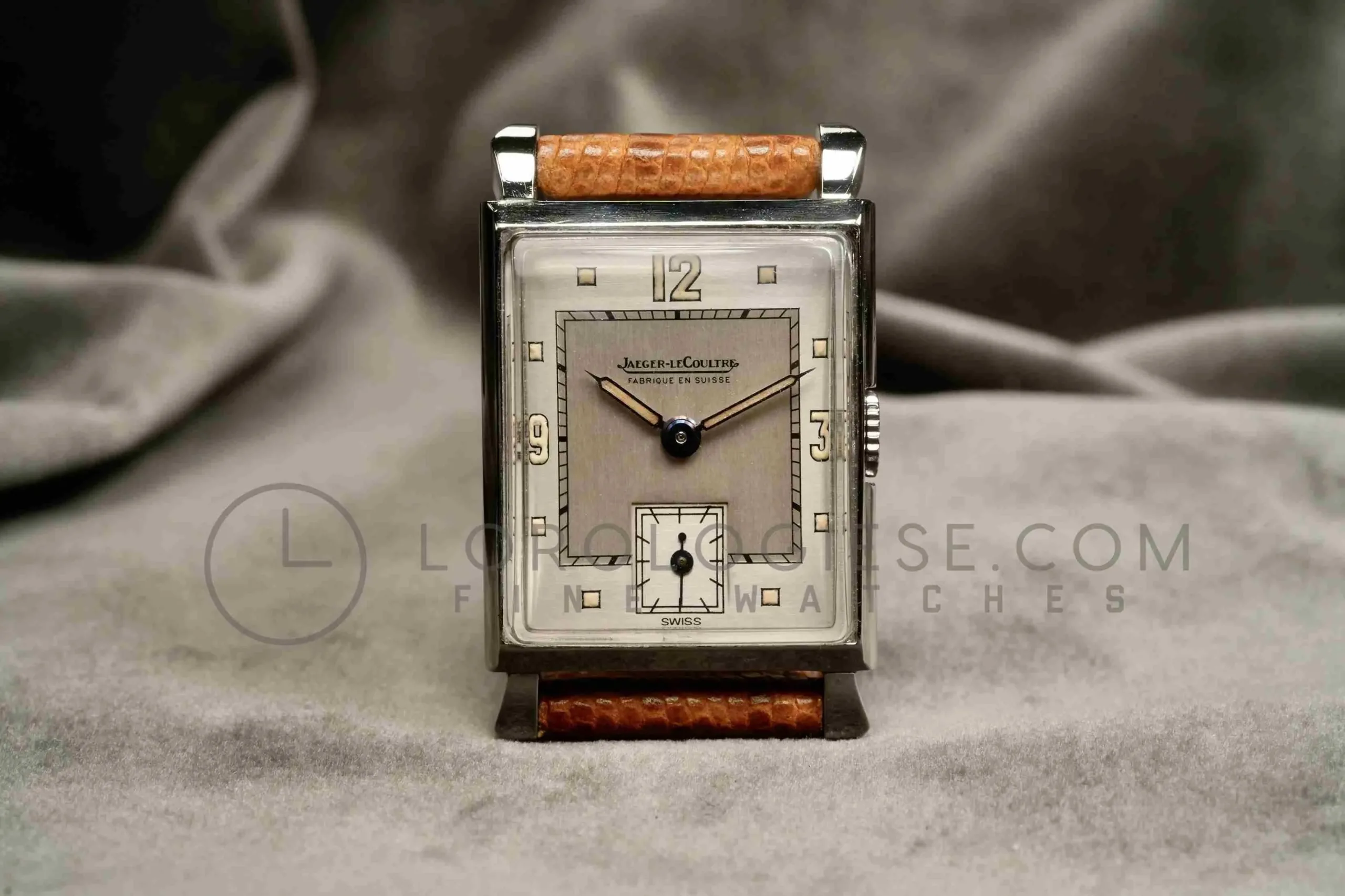 This Jaeger-LeCoultre rectangular tank-style watch is a classic of the manufacture’s Art Deco design in the 1940s, when rectangular watches epitomized modern elegance. The stainless steel case measures 22mm excluding the original crown and 35.8mm including the fancy shaped lugs. The case shows only minimal wear consistent with decades of careful handling. The snap-back caseback engages securely and shows the correct serial numbers and manufacturer markings. The Fab Suisse stamp on both caseback and dial indicates export to France during this period. The plexiglass crystal is in pristine condition. The dial has been professionally restored to two-tone silvered finish, with aged luminescent Arabic numerals and indexes. The restoration is based on the originla dial design while ensuring optimal legibility and the dial is in a perfect – as new – condition The dial back has an inscription of interesting historical significance: the Cross of Lorraine appears above the phrase “Vive de Gaulle,” followed by two names and the date 1951 with Vichy.