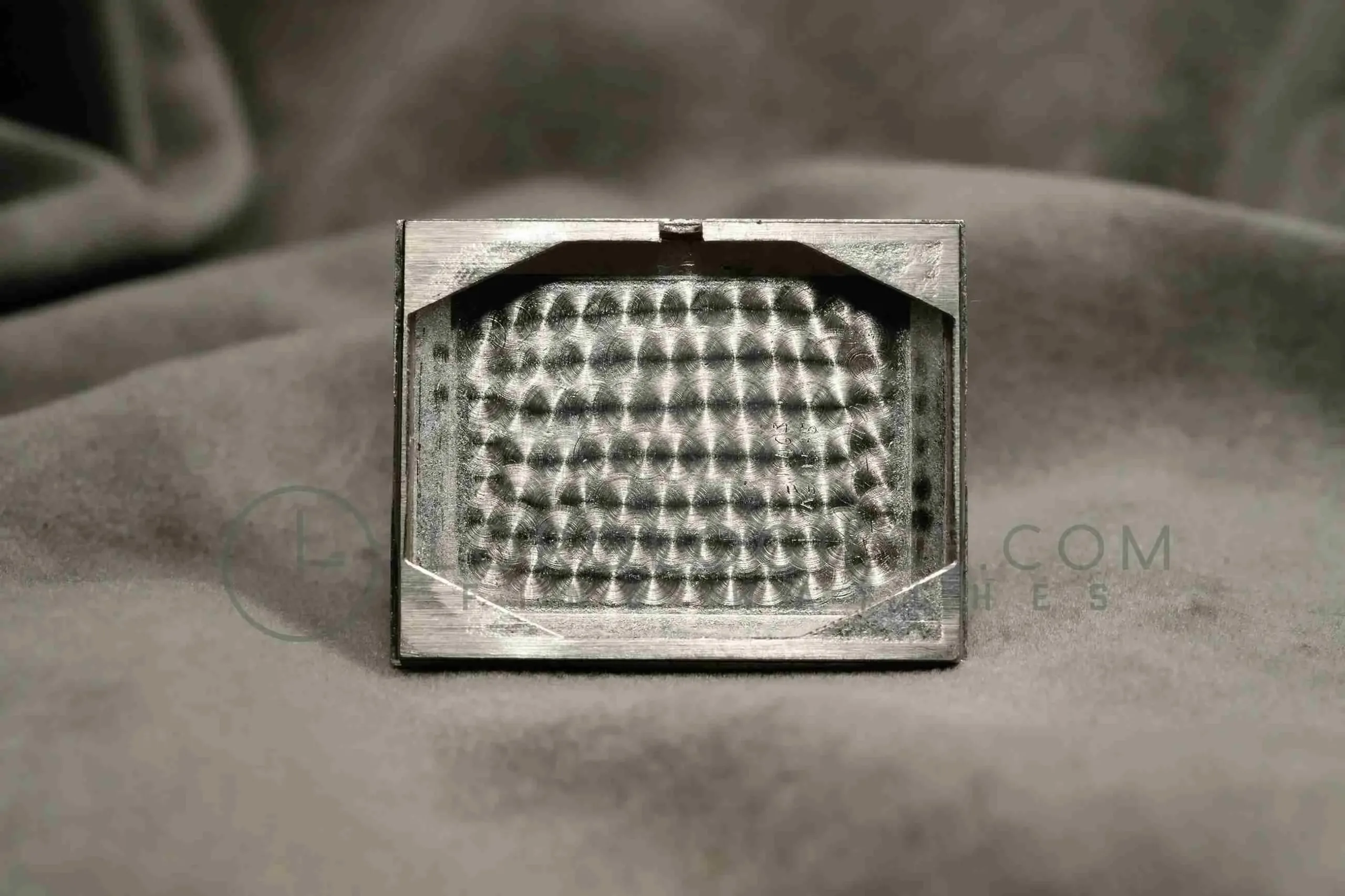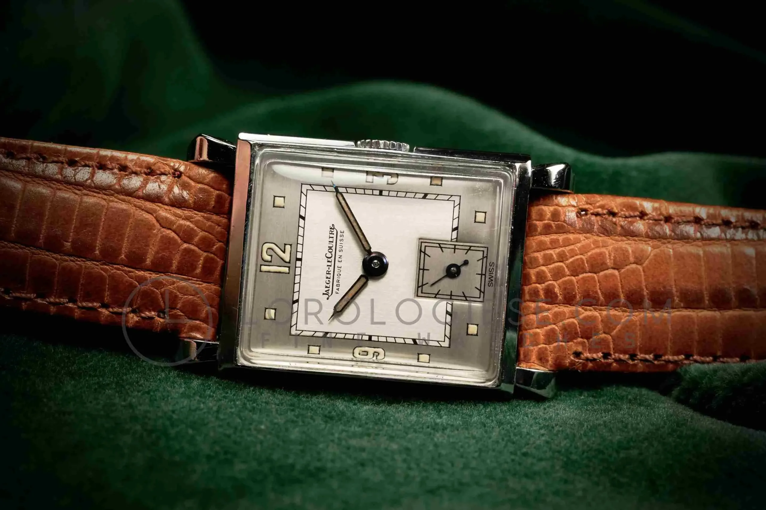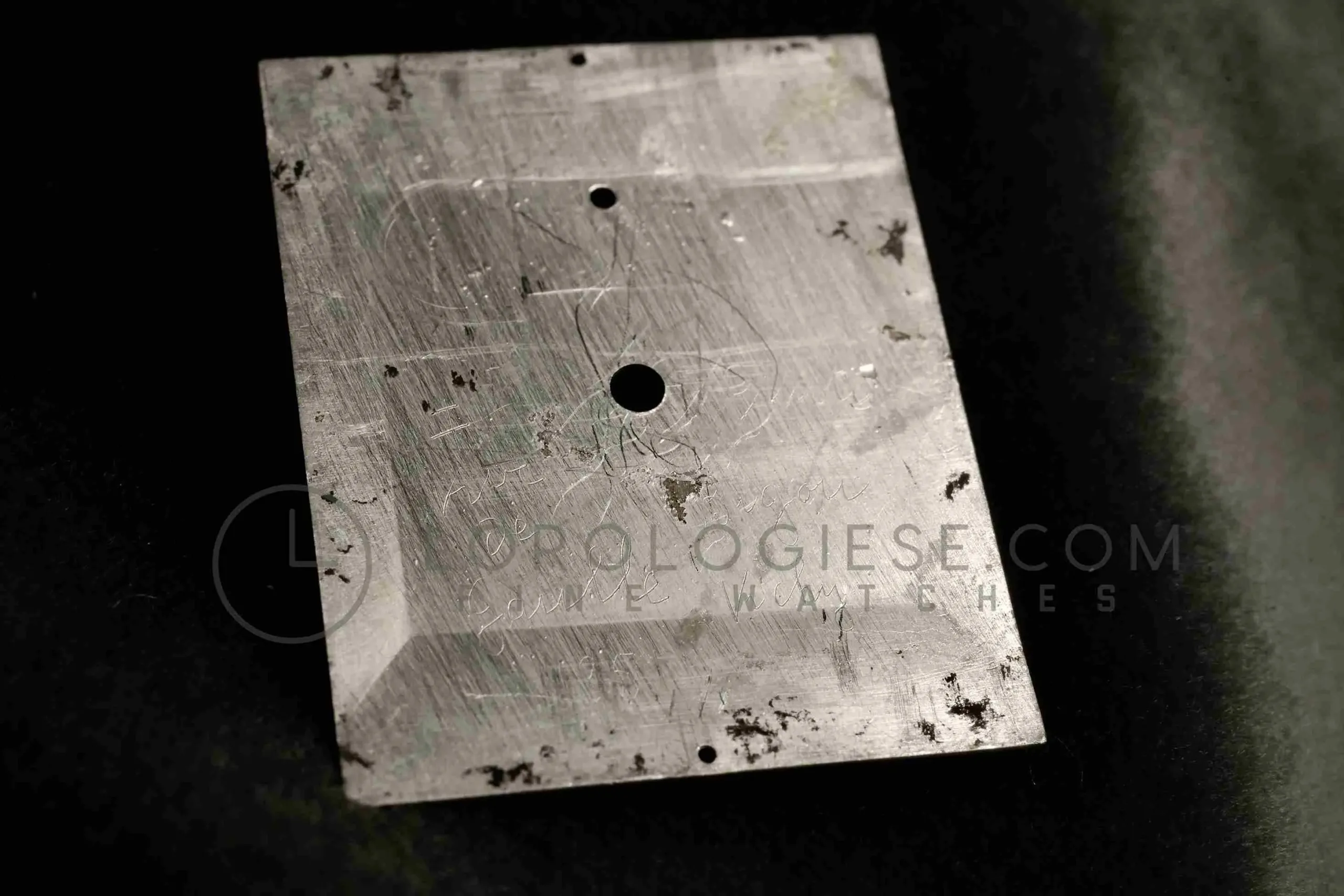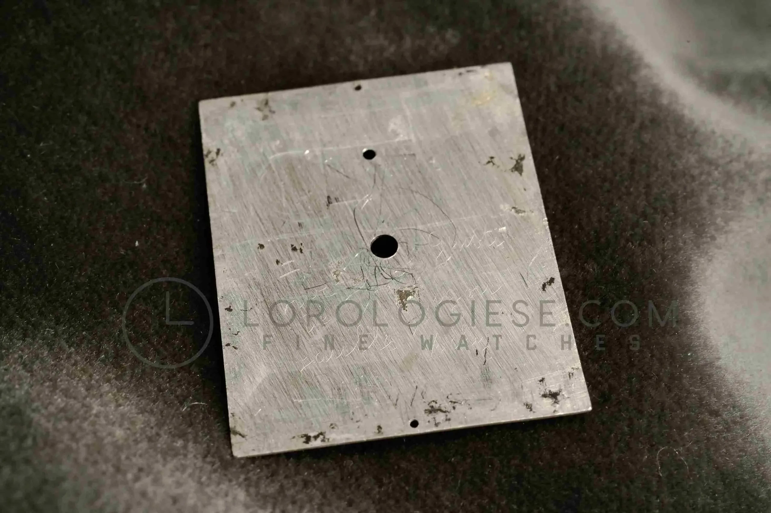 This Jaeger-LeCoultre rectangular tank-style watch is a classic of the manufacture’s Art Deco design in the 1940s, when rectangular watches epitomized modern elegance. The stainless steel case measures 22mm excluding the original crown and 35.8mm including the fancy shaped lugs. The case shows only minimal wear consistent with decades of careful handling. The snap-back caseback engages securely and shows the correct serial numbers and manufacturer markings. The Fab Suisse stamp on both caseback and dial indicates export to France during this period. The plexiglass crystal is in pristine condition. The dial has been professionally restored to two-tone silvered finish, with aged luminescent Arabic numerals and indexes. The restoration is based on the originla dial design while ensuring optimal legibility and the dial is in a perfect – as new – condition The dial back has an inscription of interesting historical significance: the Cross of Lorraine appears above the phrase “Vive de Gaulle,” followed by two names and the date 1951 with Vichy.