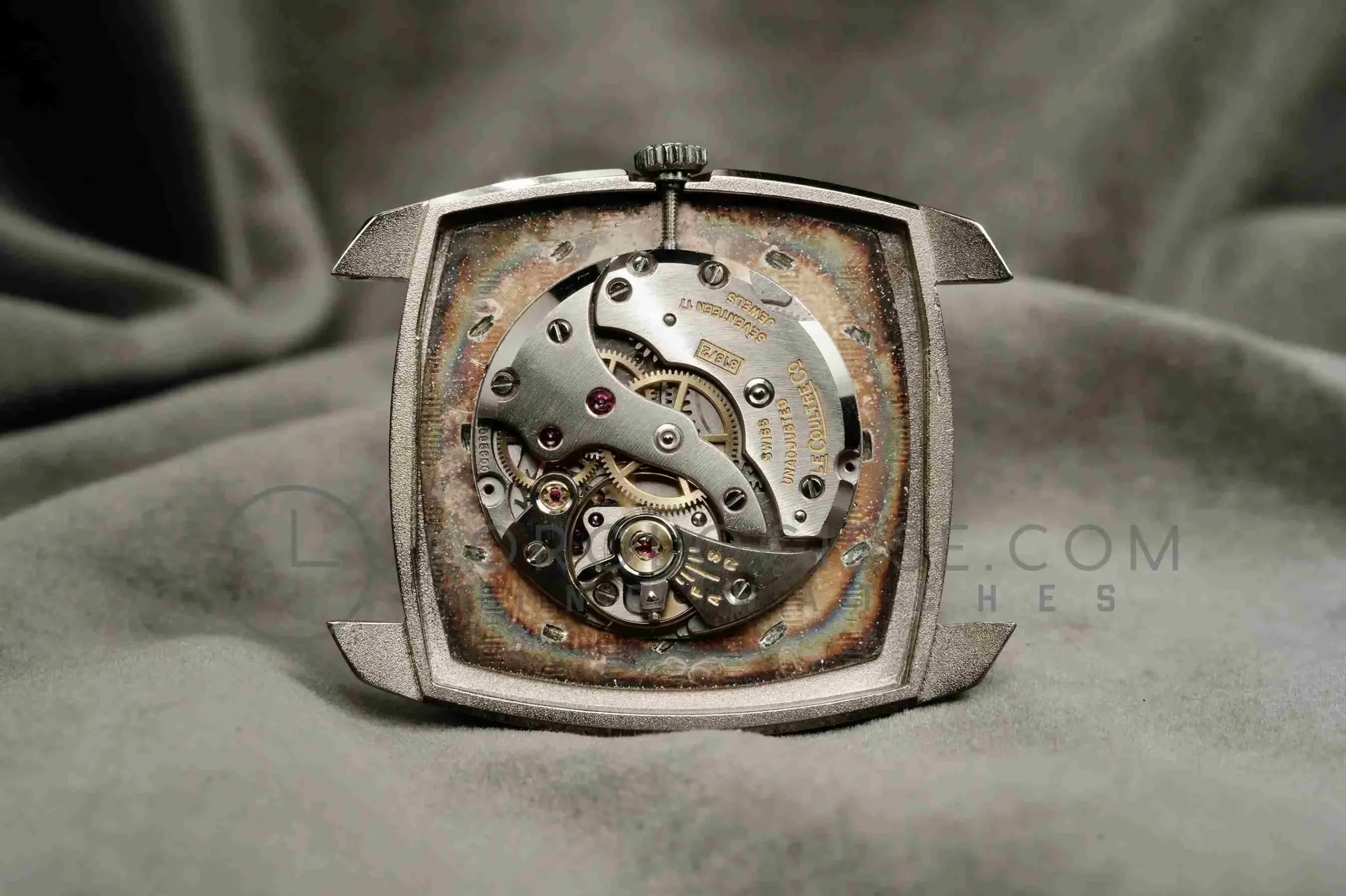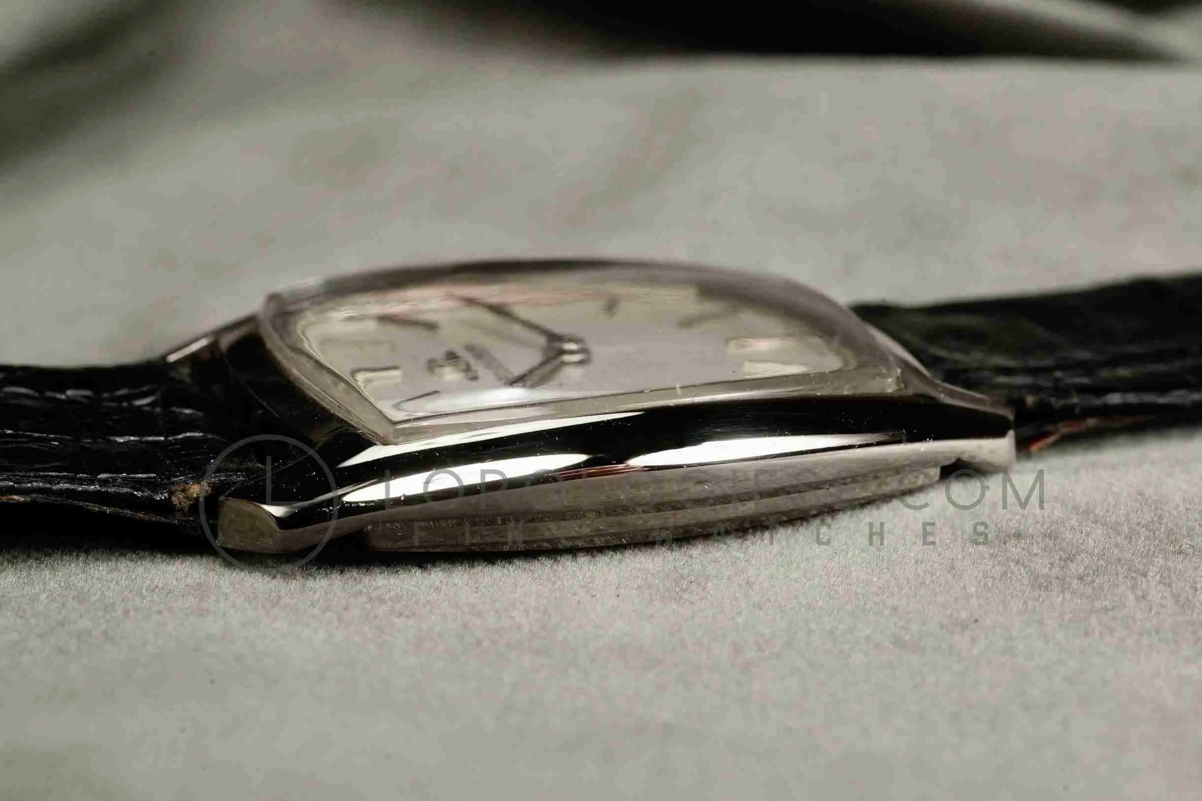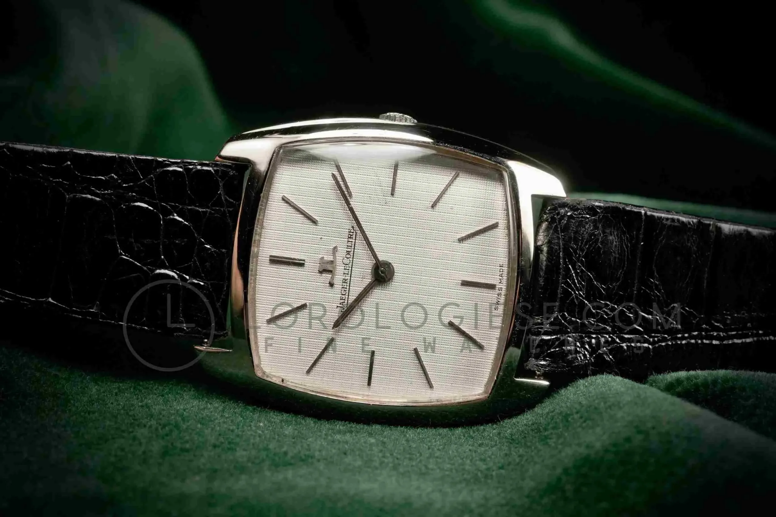 This 1960`s Jaeger-LeCoultrewhite gold ref. 9040 represents the manufacture’s exploration of new case designs, this watch is in a very good condition, it is fully original and in good working order. The 18-karat white gold case measures 30.6mm in diameter excluding the original crown and 36mm lug to lug. The case shows only minimal wear, showing only light traces of use. The snap- back caseback engages securely and bears the correct reference number, serial number, and manufacturer markings and the 18K gold stamp. The plexiglass is in an excellent condition. The original silvered “linen” dial with hand-applied baton hour markers has a clean geometric feel, complemented by the slim baton hands. The dial is crisp and shows no time patina and no discoloration or moisture damage.