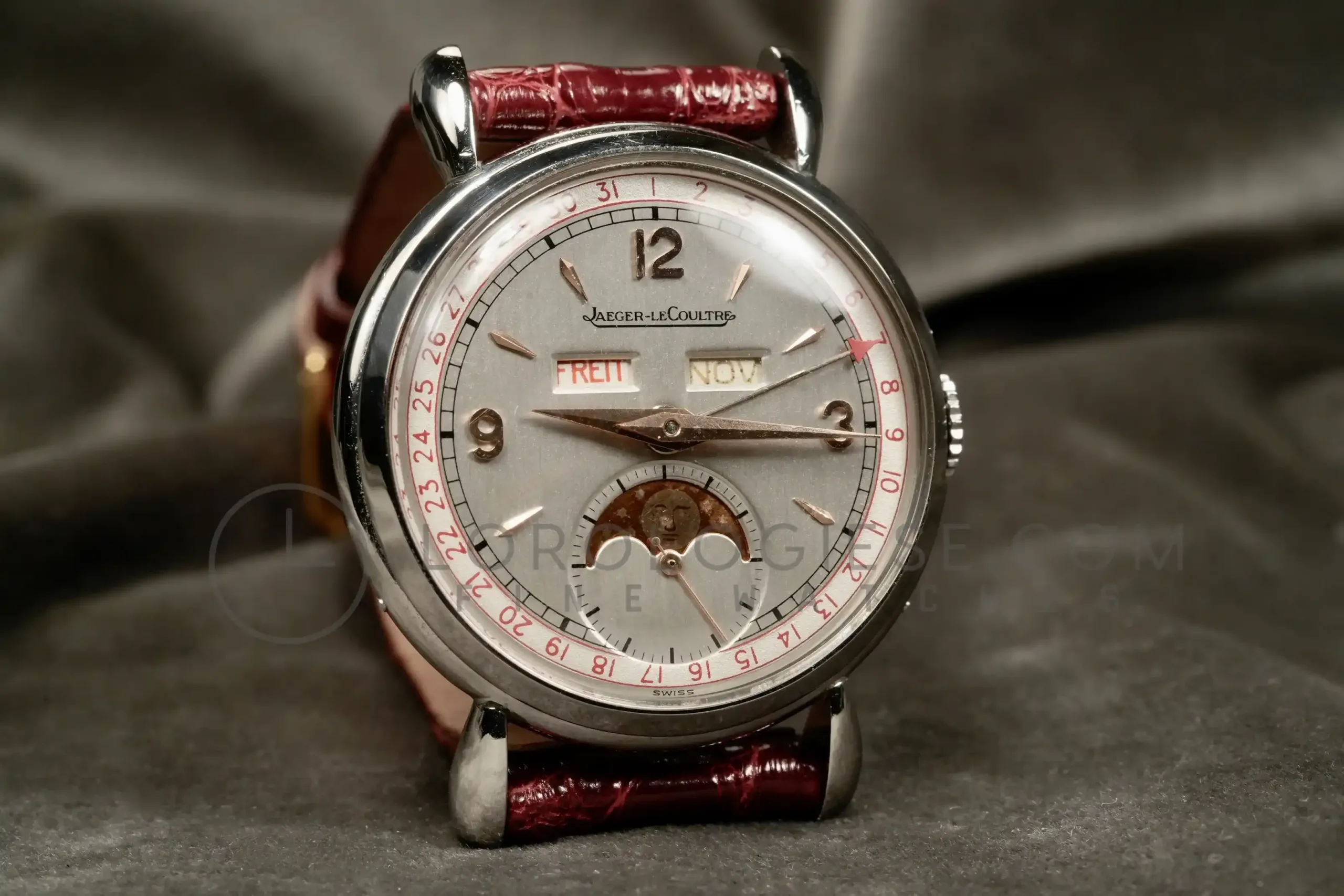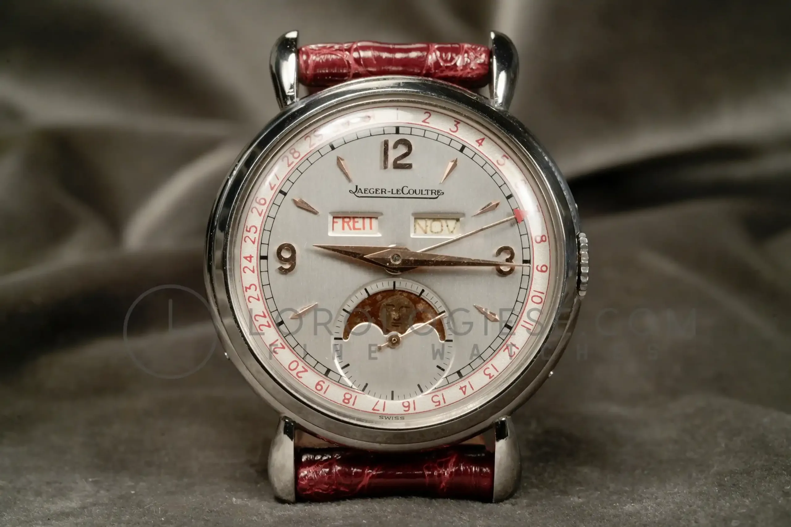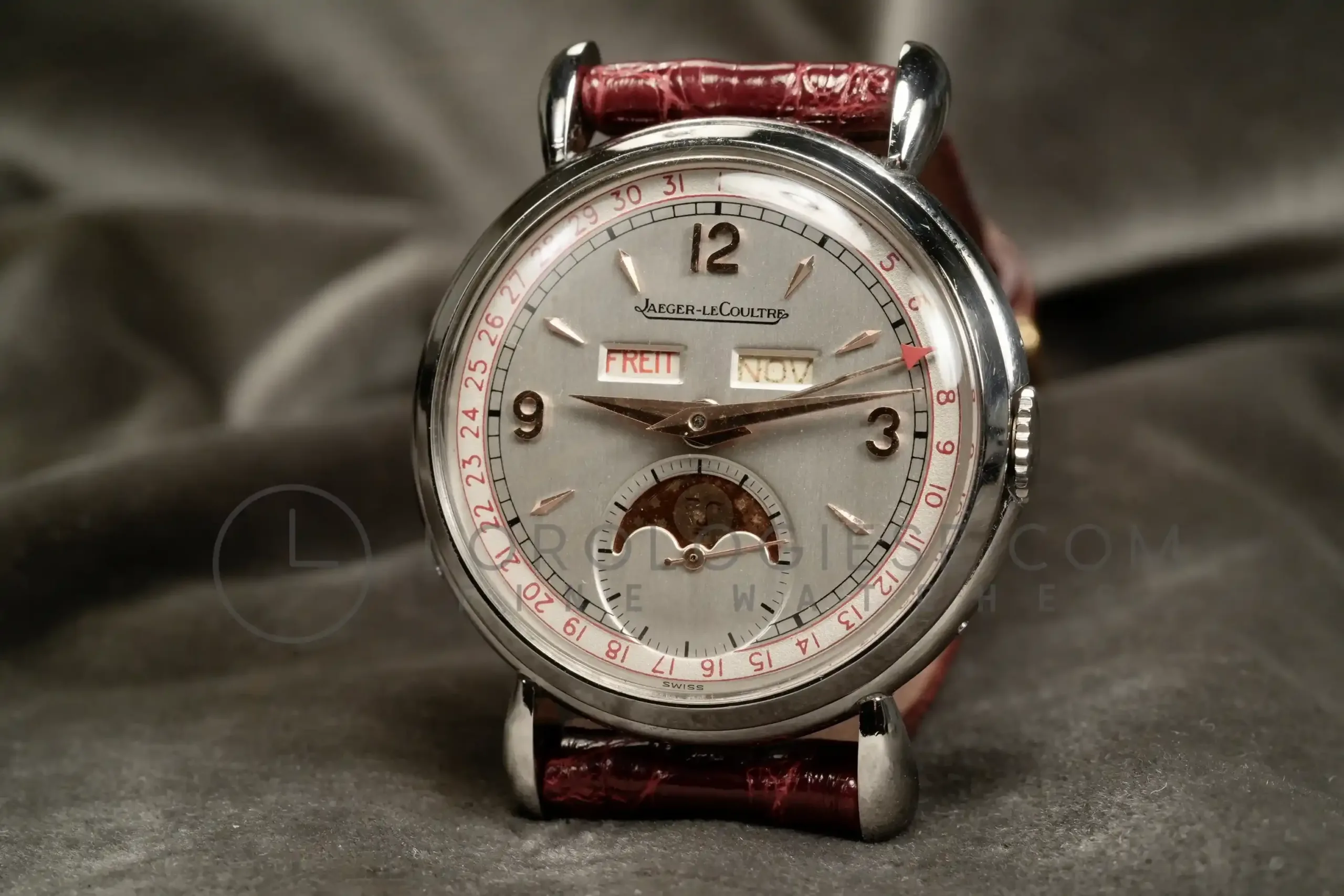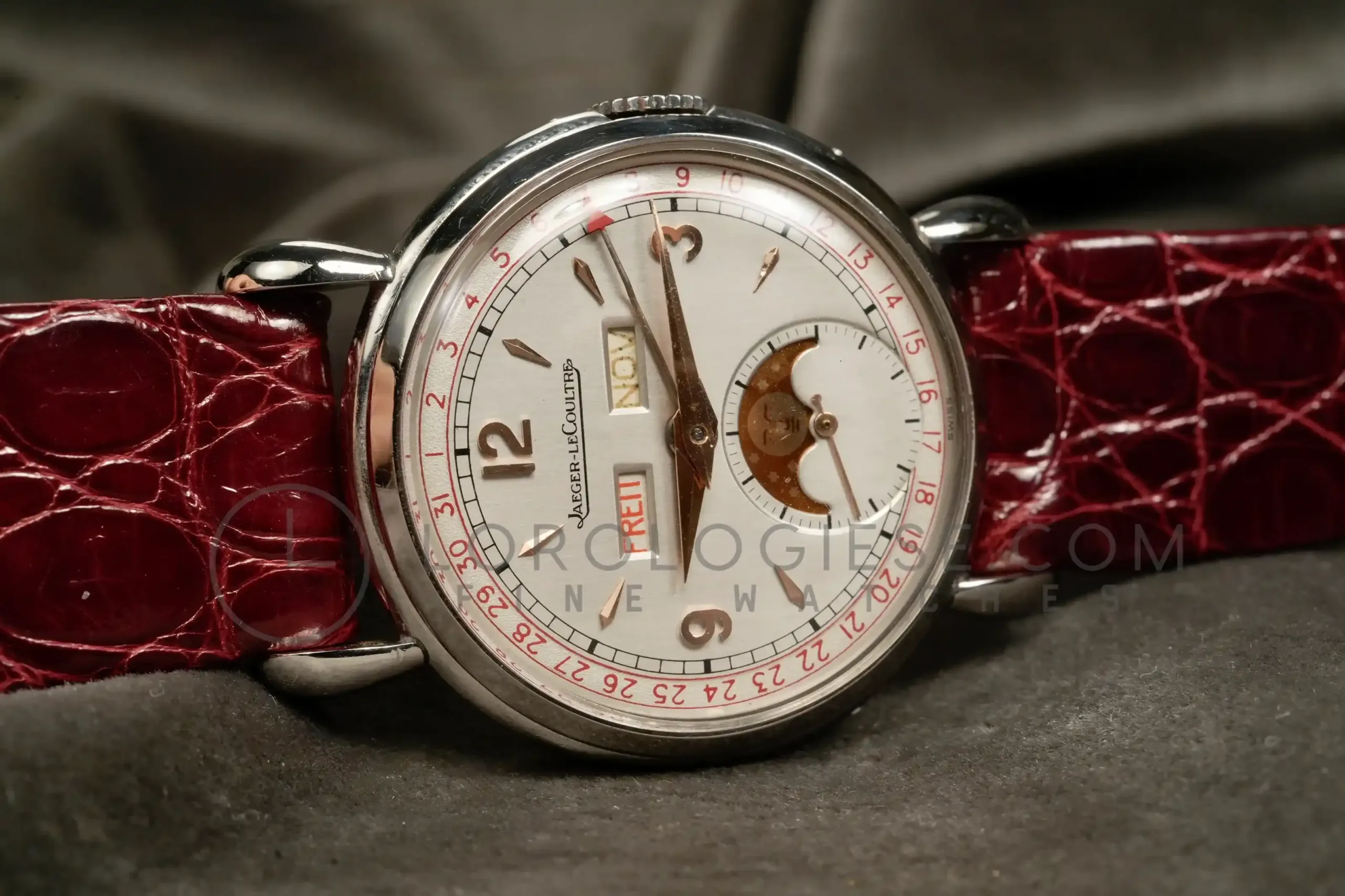 The silvered dial has been professionally restored while maintaining original style and layout. It large Arabic numerals at 3, 9, 12, arrow indexes and the apertures for day and month, a radial date track, and the moon-phase sub-dial at six. The dial is in an excellent condotion, it has no time patina and no oxodations; the moon disk shows slight fading consistent with age. Powered by the manual-wind Jaeger‐LeCoultre Calibre P494/1A, this movement is a manually wound caliber part of a generation of high-grade calendar calibers produced by the manufacture during the post-war period. It is a three bridges movement with subsidiary seconds, designed to accommodate triple calendar and moonphase complications in a compact form. Built on the base architecture of the earlier Cal. 464 and 463 families, the P494/1A operates at 18,000 vibrations per hour and has 17 jewels. It has meticulous finishing: Geneva stripes (Côtes de Genève), perlage on the baseplate and anglage. (the edges are beveled and hand polished). Today, it is highly respected among collectors and watchmakers for its durability, elegant layout, and the harmony between its aesthetic and mechanical quality. The watch is fitted with a vintage crocodile strap .