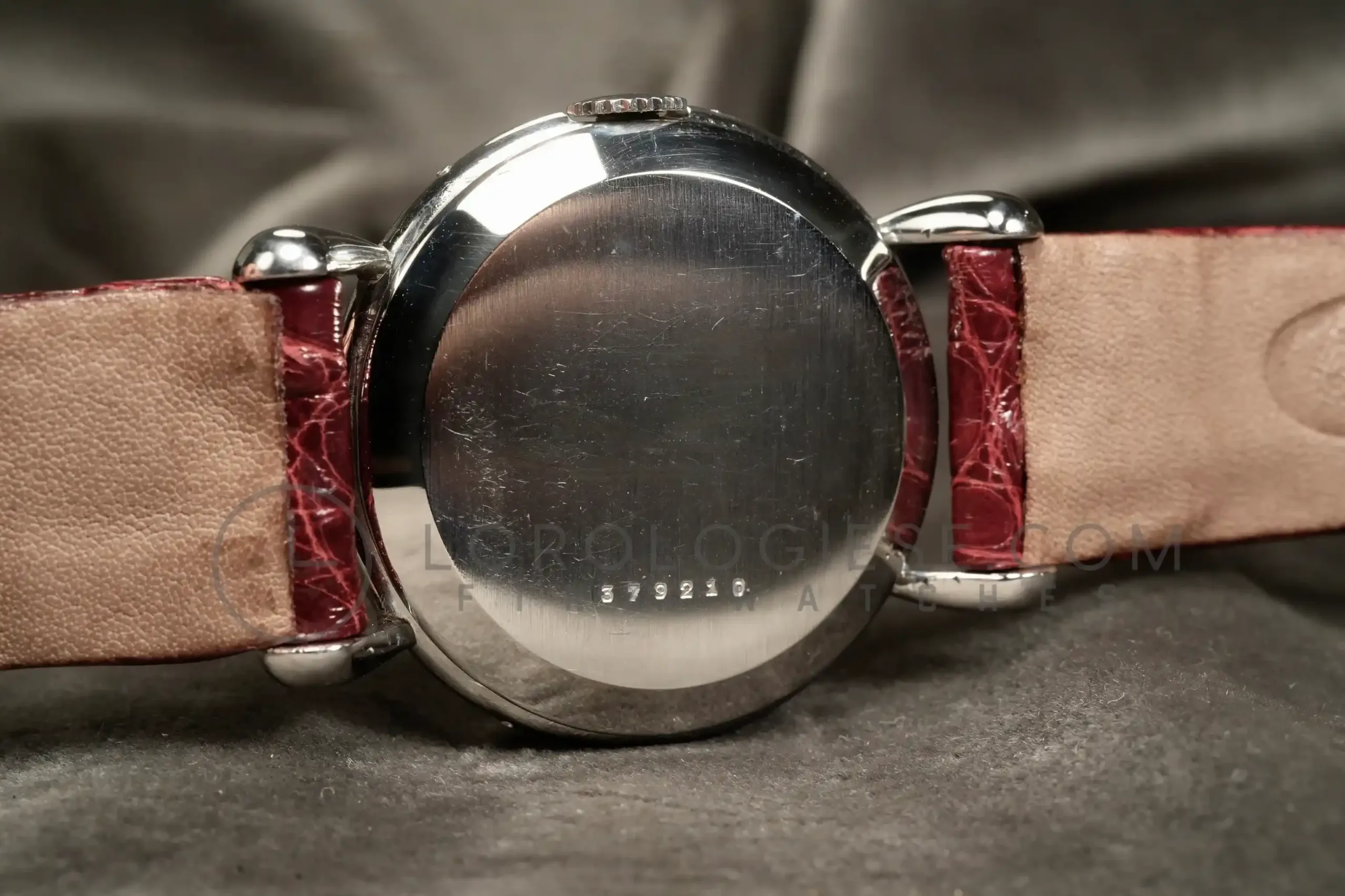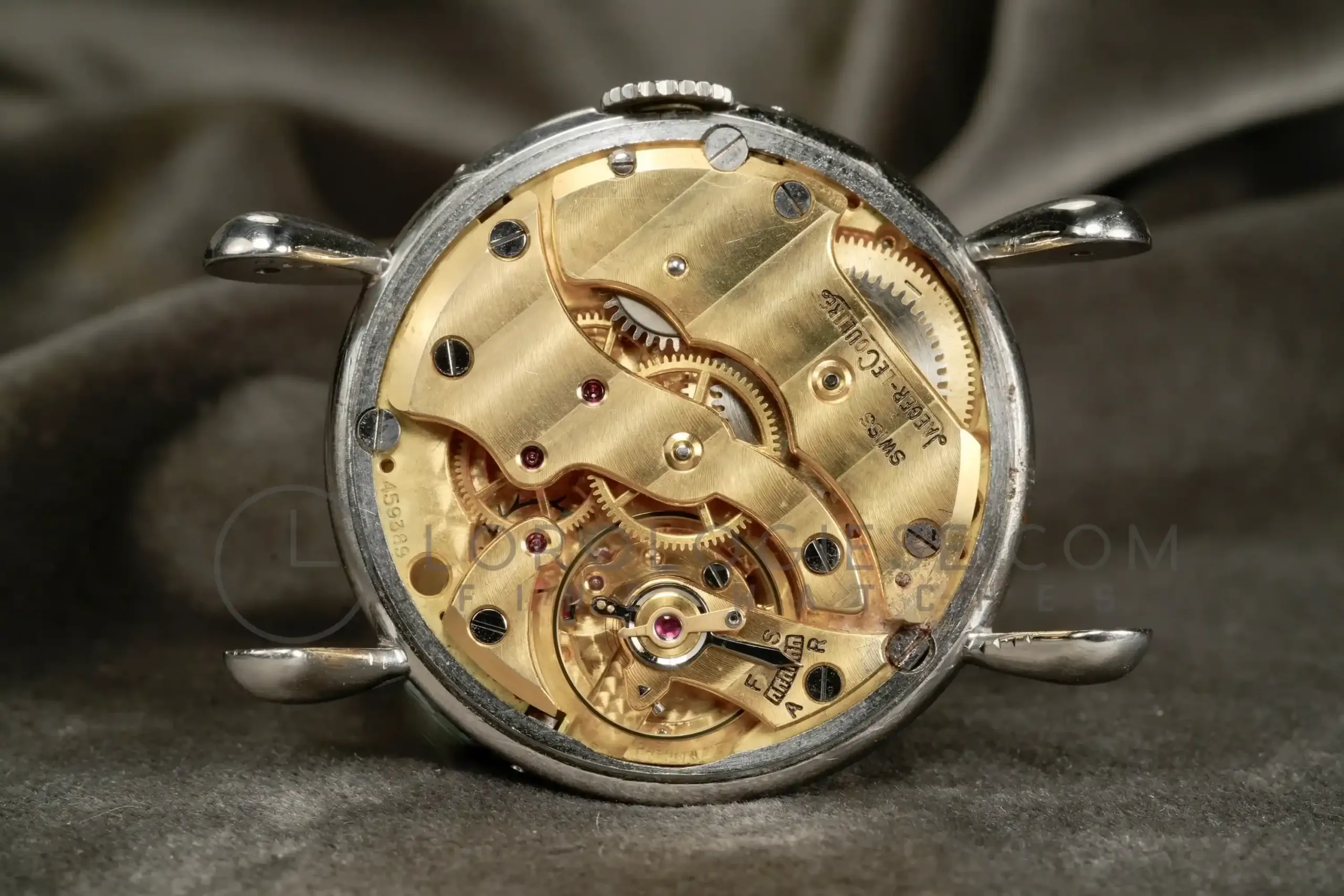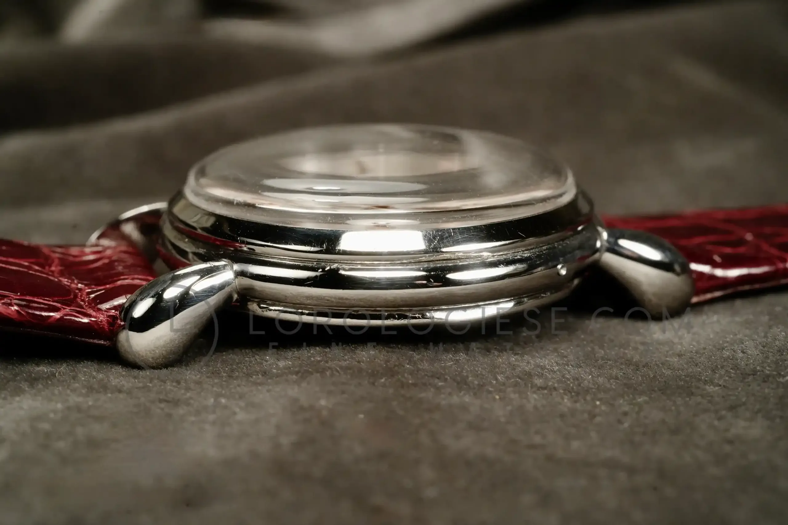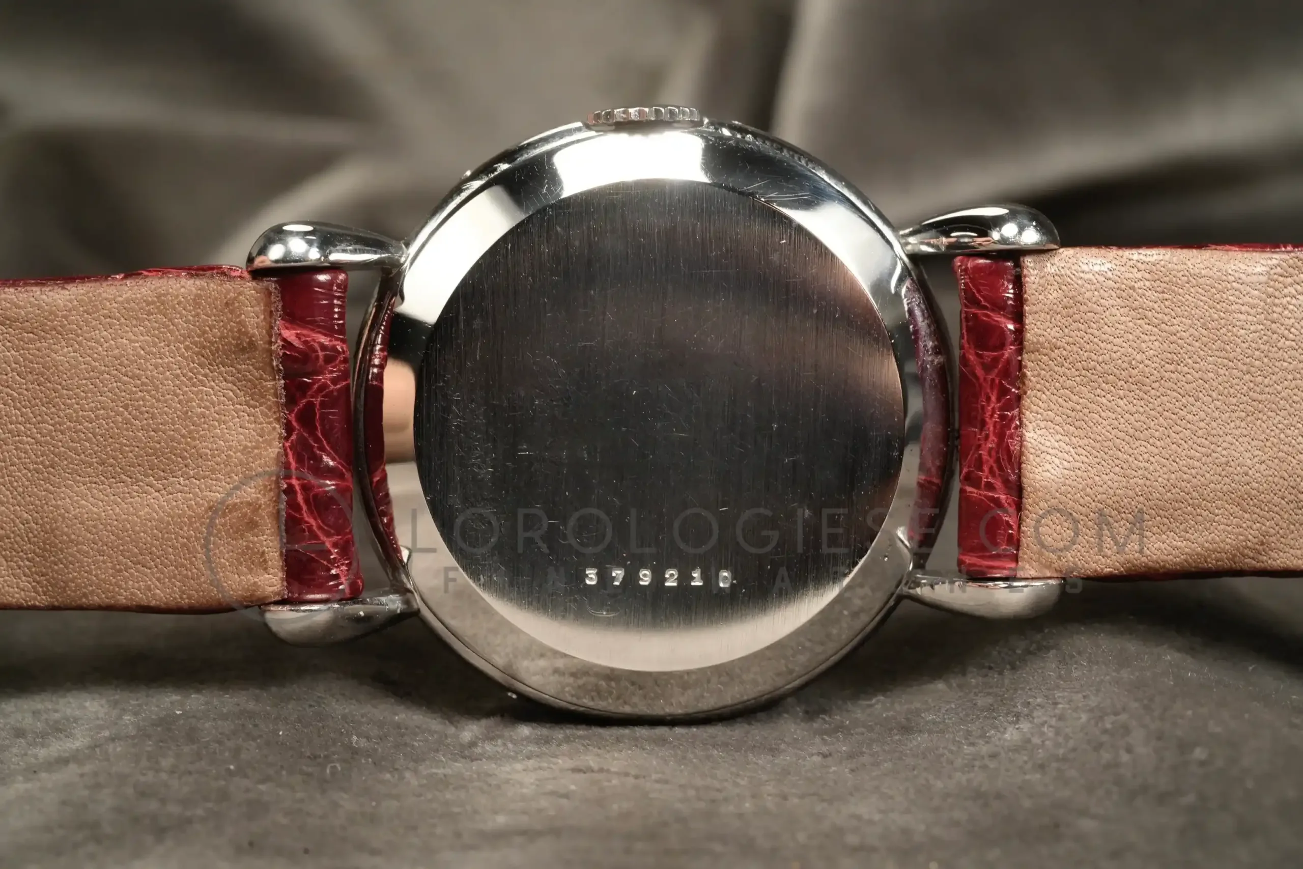 The silvered dial has been professionally restored while maintaining original style and layout. It large Arabic numerals at 3, 9, 12, arrow indexes and the apertures for day and month, a radial date track, and the moon-phase sub-dial at six. The dial is in an excellent condotion, it has no time patina and no oxodations; the moon disk shows slight fading consistent with age. Powered by the manual-wind Jaeger‐LeCoultre Calibre P494/1A, this movement is a manually wound caliber part of a generation of high-grade calendar calibers produced by the manufacture during the post-war period. It is a three bridges movement with subsidiary seconds, designed to accommodate triple calendar and moonphase complications in a compact form. Built on the base architecture of the earlier Cal. 464 and 463 families, the P494/1A operates at 18,000 vibrations per hour and has 17 jewels. It has meticulous finishing: Geneva stripes (Côtes de Genève), perlage on the baseplate and anglage. (the edges are beveled and hand polished). Today, it is highly respected among collectors and watchmakers for its durability, elegant layout, and the harmony between its aesthetic and mechanical quality. The watch is fitted with a vintage crocodile strap .