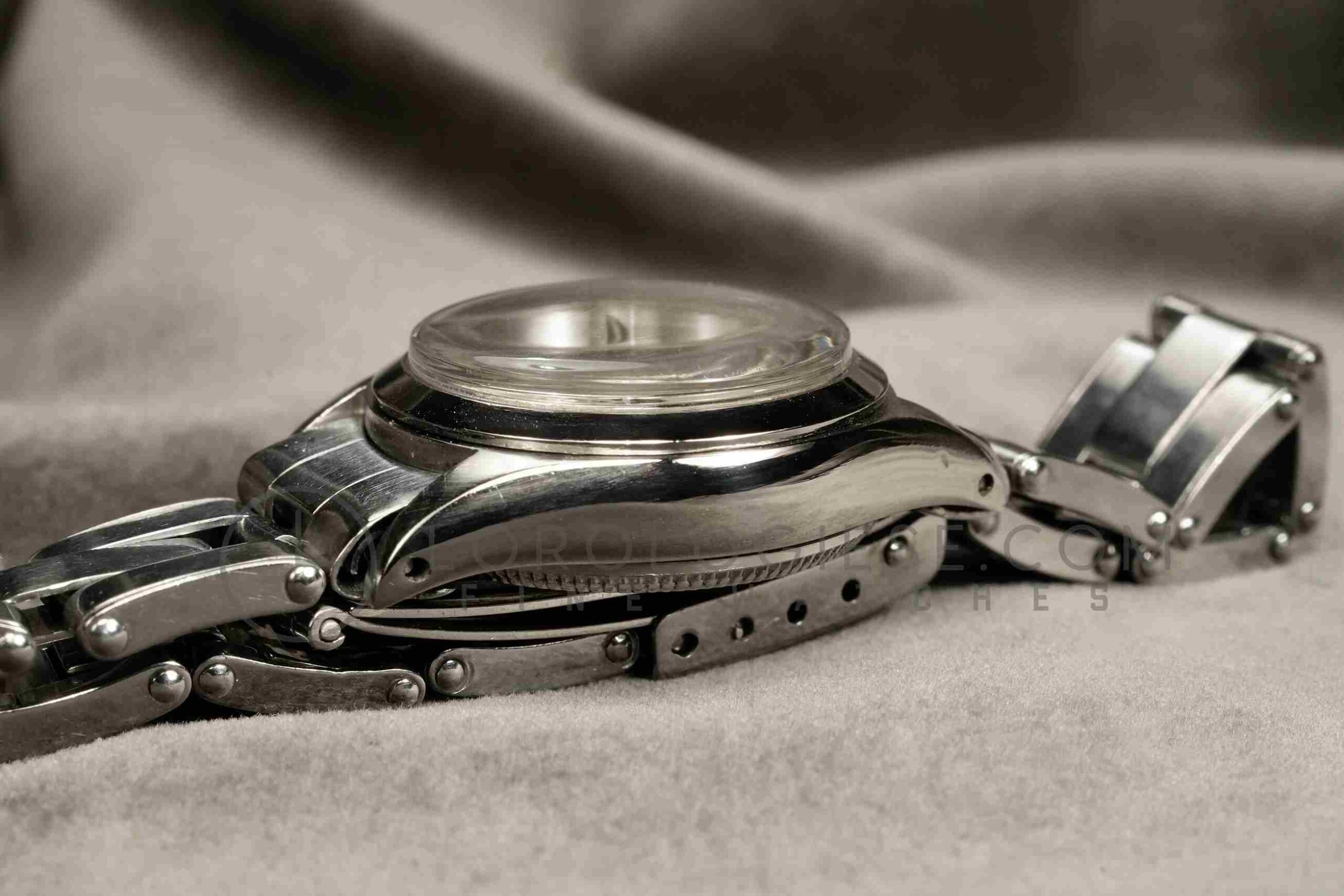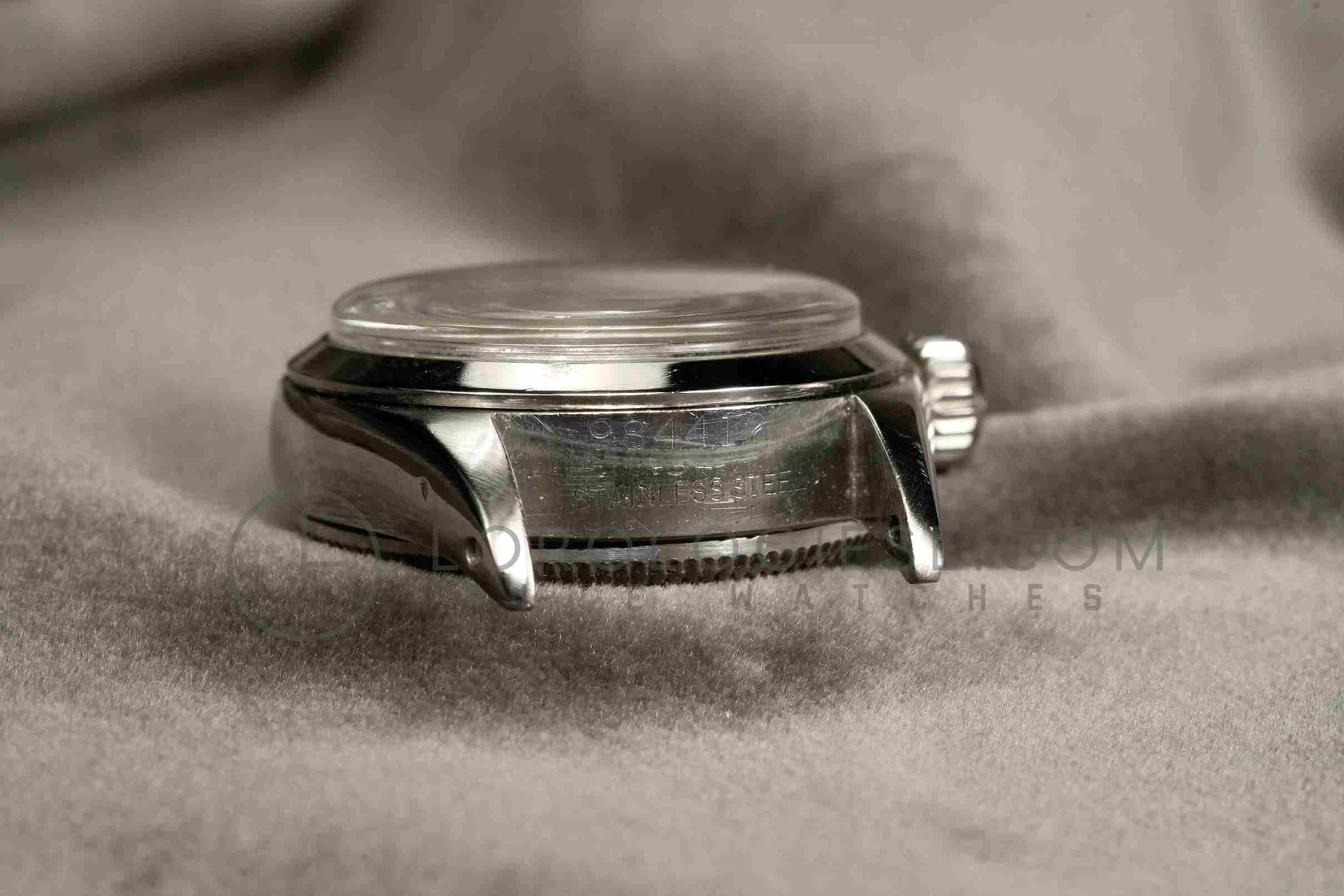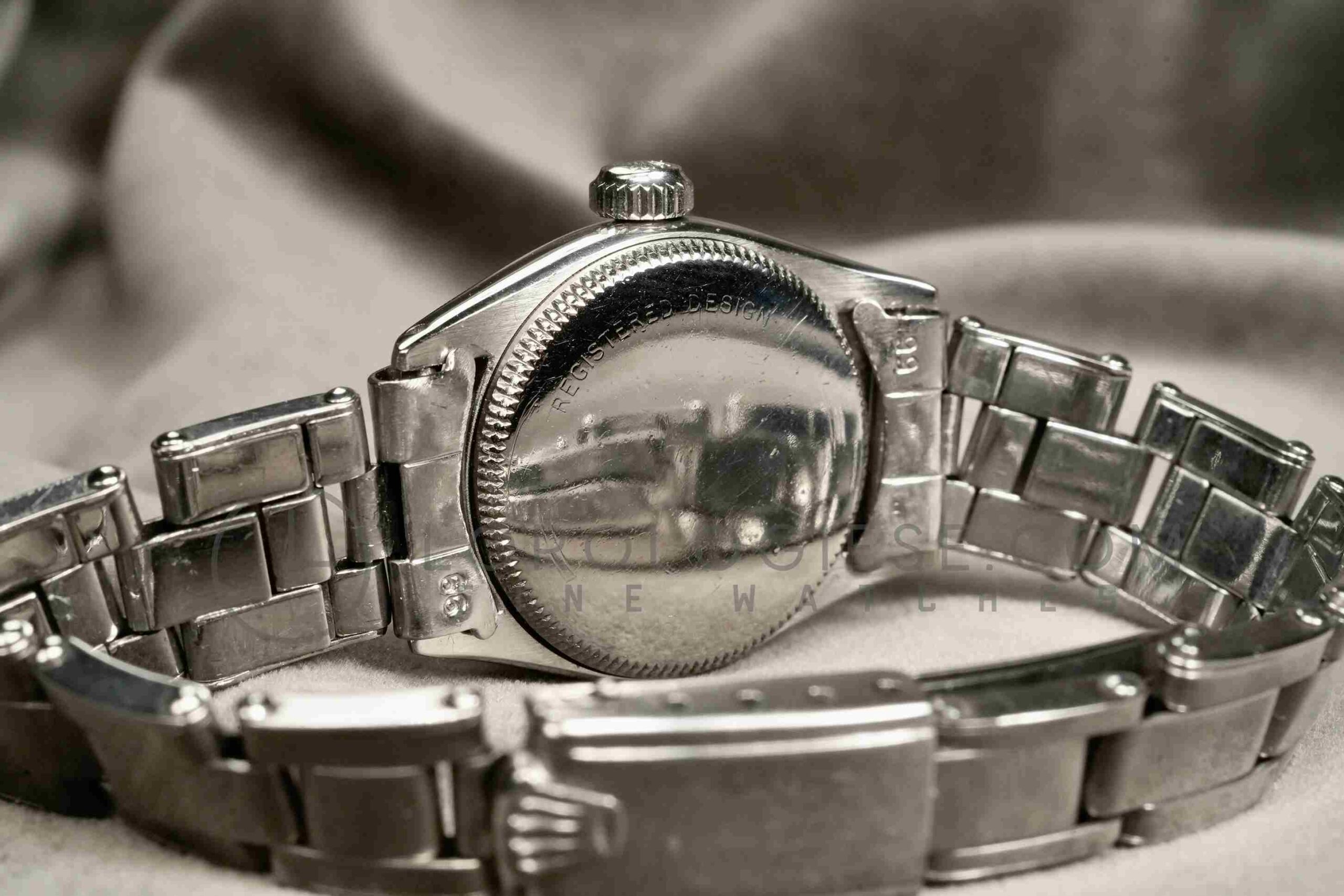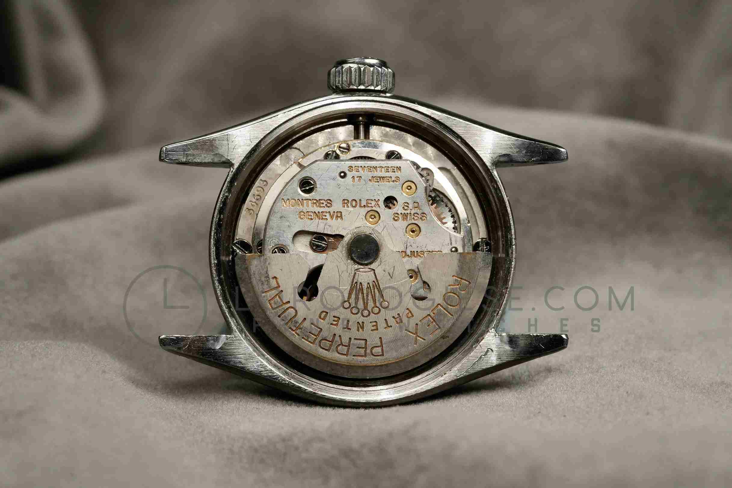 The professionally restored silvered “waffle” dial offers a good legibility, it has a light and ebven time patina with applied arrow indexes and dauphine hands. Waffle-textured Rolex dials are a known 1950`s variant prized for their tactile guilloché effect and light play. The dial is very legible and has a small-seconds counter at 6 o`clock Powering the watch is the automatic Rolex calibre 1120, a small-format self-winding movement with the characteristic butterfly rotor. It has 27 jewels and a beat rate of 19,800 vph, with Swiss- lever escapement and shock protection. The 1120 was purpose-built for compact Oyster Perpetual models of the era and is regarded for robust performance in small cases. The watch is fitted with its original riveted Oyster stainless-steel bracelet, fully signed, dated 1961 on the clasp, and measuring approximately 17 cm in overall length. Links articulate correctly and the folding clasp closes securely, aligning with period bracelet construction.