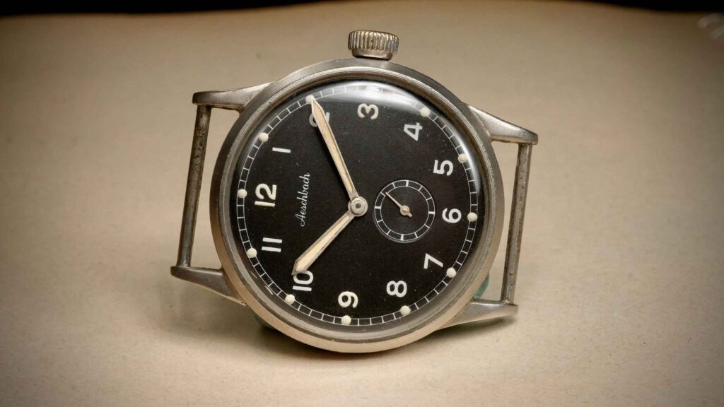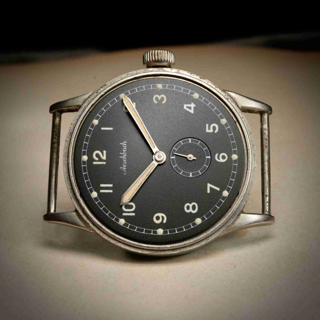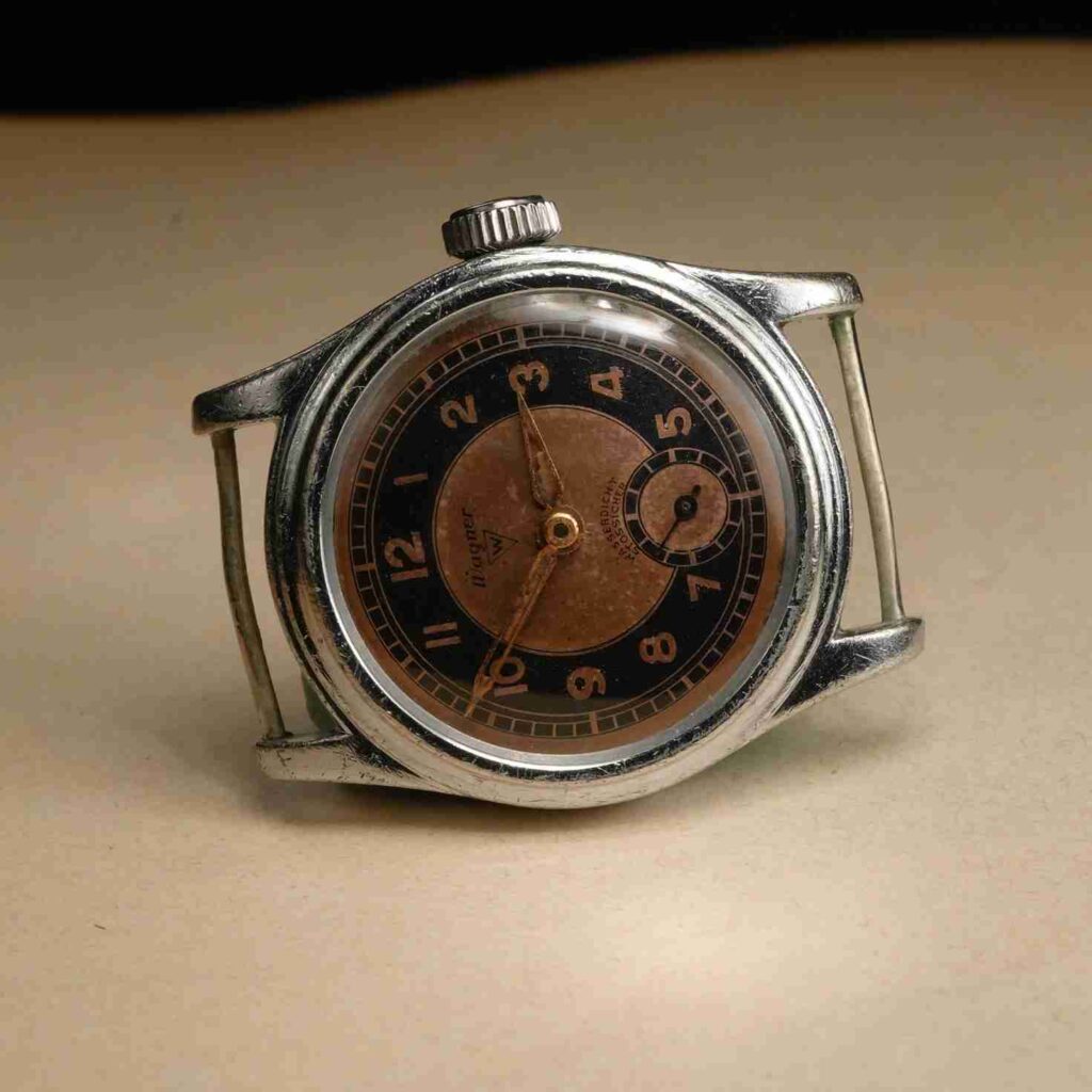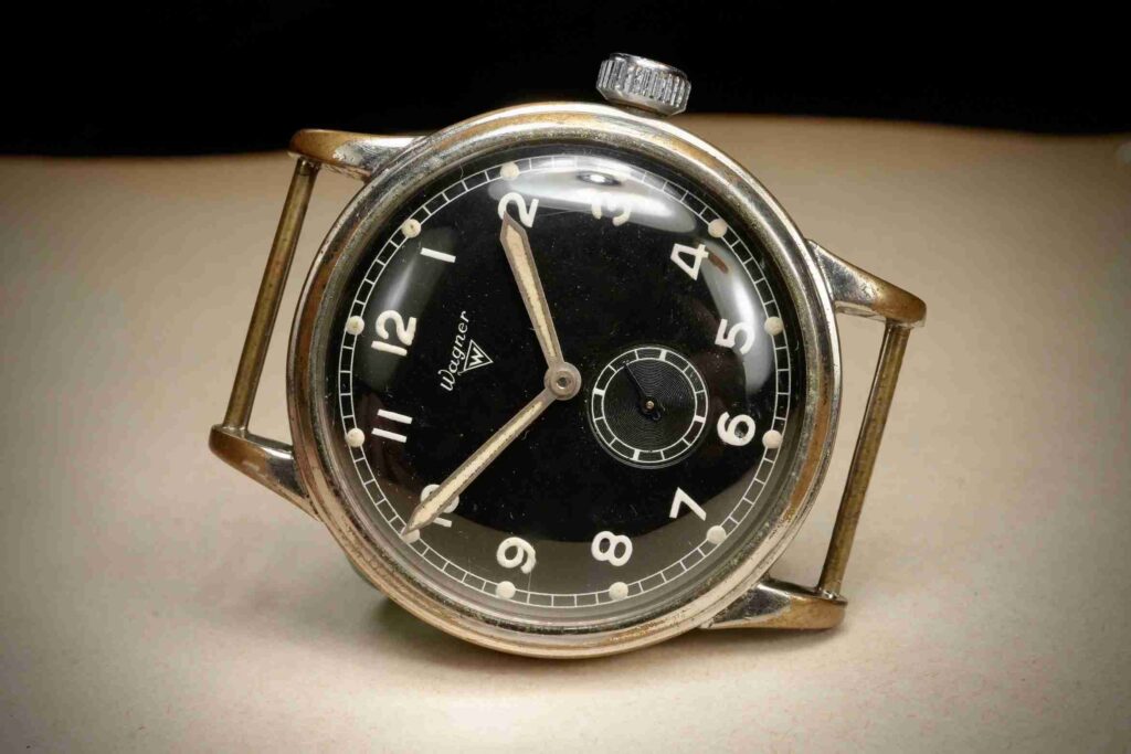 Provenance often relies on caseback engravings, unit-stamped accessories, or inclusion in specialist references/collections; for instance, Wagner and Aeschbach pieces surface in dedicated militaria dealers and archives, sometimes cross-referenced to standard works (e.g., Knirim) via listing notes.